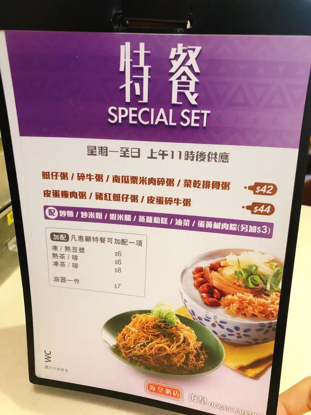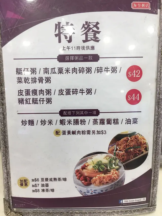近排天口好熱,成日食晏嘅時候都冇乜胃口,唔知食咩好經過海皇粥店,諗住不如清清地食碗粥算海皇粥店唔止有粥食,仲有好多唔同類型的茶餐廳飯、麵簡入到去唔想食粥,都可以有好多野比你叫<特餐$42>望咗一輪餐牌,都係決定食下佢嘅粥品晏晝可以叫特餐,包一碗指定款式嘅粥同埋一款小食Fatbrown 叫咗碗艇仔粥,牛肉碎仲可以轉豬肉碎,都幾貼心艇仔粥嘅份量中規中矩,豬肉嘅份量唔多,不過豬皮同魷魚嘅份量就幾多豬肉有少少鞋口,不過因為份量唔多,所以都不足為患,唔係好影響滿足嘅口感另外加着款小食蘿蔔糕,夠蘿蔔糕超巨型,不過偏粉,唔算好好食查看更多