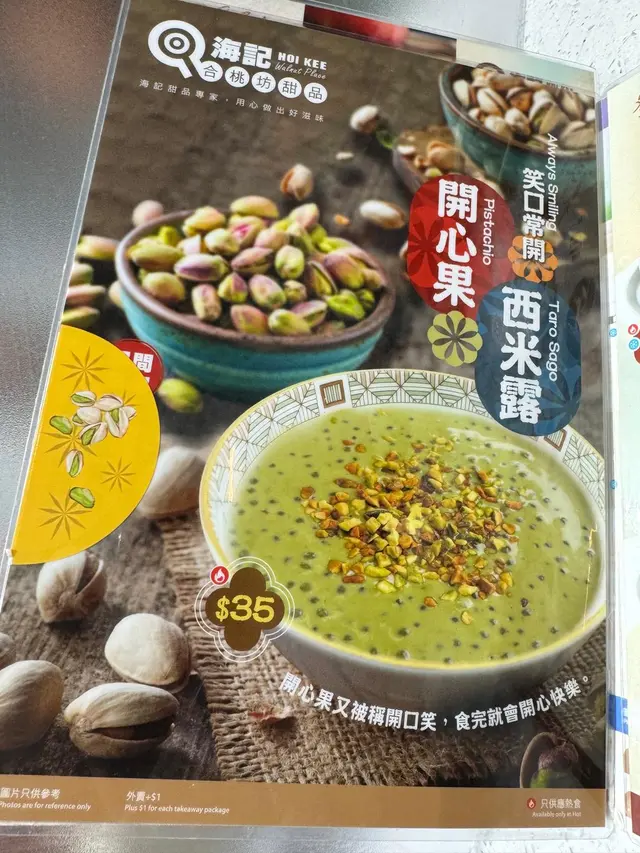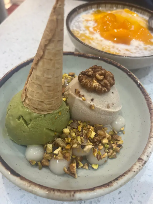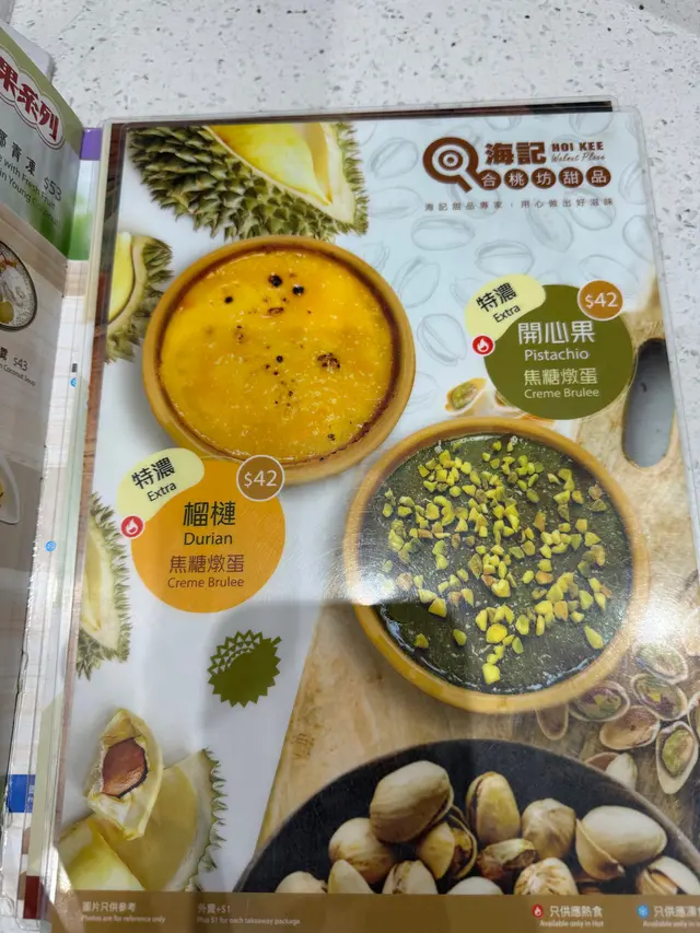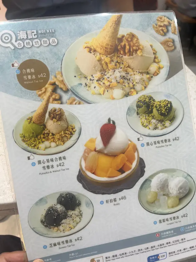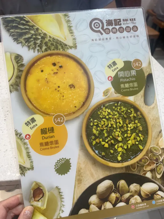 海記合桃坊甜品點了兩款甜品, 都不錯。首先店的生意不錯, 我們八人去當然要等位, 等了約十分鐘, 都算合理, 如果晚一點去, 人流就不會那麼多。開心果雪糕:味道不俗, 有開心果香, 沒有冰塊或沙冰, 而是很綿滑的, 不錯。合桃雪糕: 味道還好, 不及開心果好吃, 合桃味沒有很香, 也沒有很突出, 還以為合桃是鎮店招牌, 但結果有點失望, 味道還好, 沒有要點的必要, 寧可點兩球開心果雪糕。但雪糕的質感是可以的。合桃沒有很香, 如果用焦糖合桃當然更好。丸子不過不失, 沒有加分, 也沒有扣分, 有多點口感, 但它本身沒甚麼味道, 所以與其用丸子, 不如加多點開心果碎, 或者焦糖開心果碎。還點了開心果cream brulee, 這個好吃, 因為之前都只吃過原味的, 第一次試開心果味, 有驚喜。首先它的厚薄適中, 所以吃起來又滿足, 又不會太膩。表面那層焦糖又薄又脆, 不會鎅口, 好吃, 薄薄的有增加口感。底下的燉蛋相當綿滑細膩, 開心果味很香, 我覺得比雪糕的開心果味更濃郁, 相當滋味, 每一口都是享受, 好好吃。我一個人都可以吃光一個, 不會膩, 兩人分享也不錯, 這款特色甜品我會推介。價錢也不算貴, 42元很合理, 尤其開心果原材料是那麼貴的情況下, 所以這一款我推介一試。…查看更多
