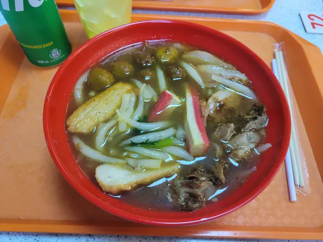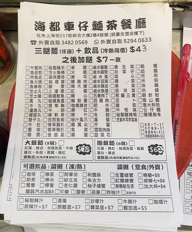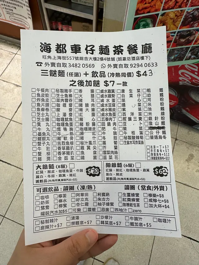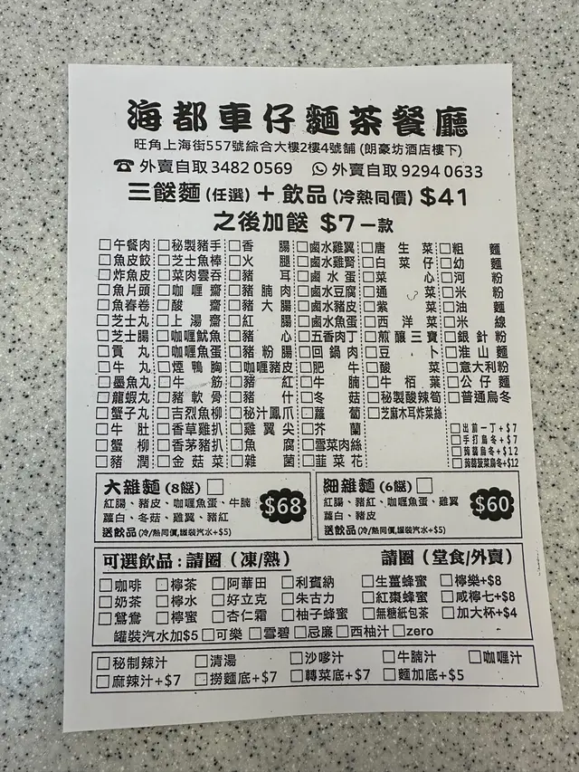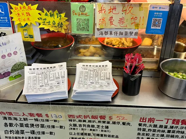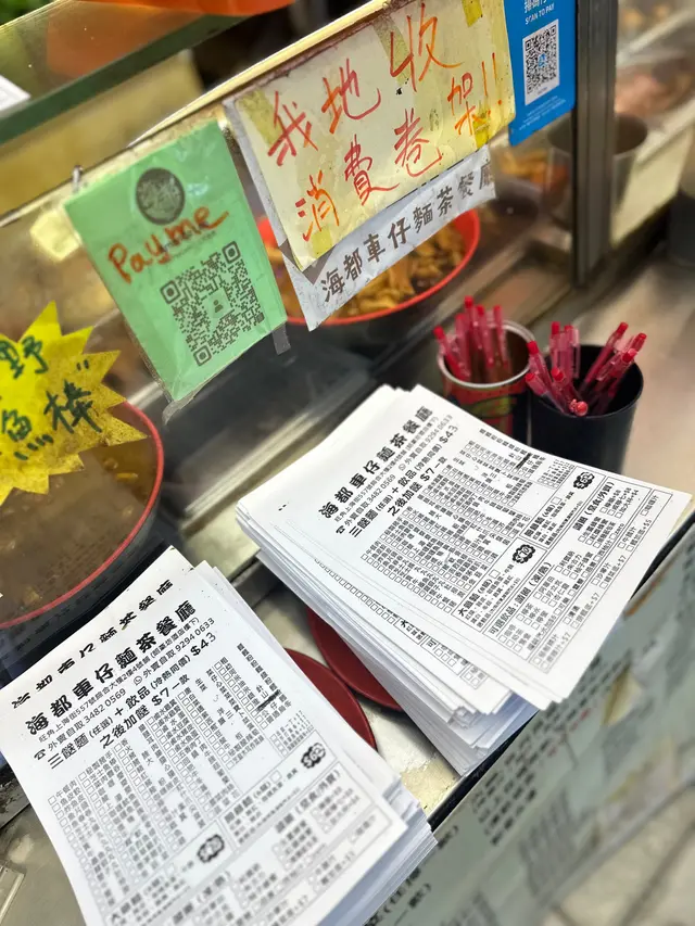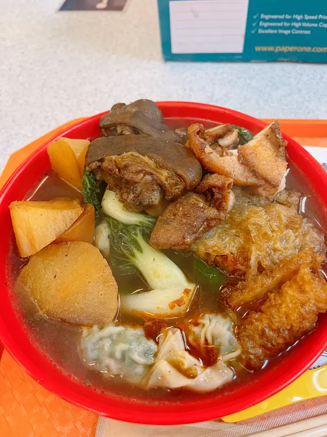 海都車仔麵茶餐廳是在旺角熟食中心的小店,道車仔麵為特色,店舖前方設有自助區,提供蔥、炸蒜及自製辣醬,讓顧客自行添加。我今天點了一個牛魔皇套餐,套餐包括牛肚、牛筋、牛腩、牛丸、滑牛肉和牛柏葉,選擇了秘製辣汁配搭米粉。牛肚爽口彈牙,而滑牛肉帶有咬口,肉質鮮嫩。不得不提及的是其秘製辣汁味道濃郁,辣度過人,後勁凌厲卻不過於麻木,帶有層次感,絕對是辣味愛好者的必試之選。米粉吸滿醬汁,惹味。另外,我和朋友還選了四餸車仔麵,三餸為經濟配搭,我升級至四餸,選了蘿蔔、豆卜、豬腩肉和香茅豬扒,配搭沙嗲汁及粗麵。豬腩肉入味軟腍,入口即化,口感一流。蘿蔔外表有咬口,內裏軟腍且入味,而香茅豬扒浸湯後軟硬兼備,香茅味道突出。粗麵帶有微蛋香,配上沙嗲汁的濃郁香氣。飲品方面我點了凍檸茶和凍檸樂。凍檸茶茶底濃郁,與經典茶記口味一致,搭配新鮮檸檬,酸甜適中,解膩又提神。凍檸樂同樣使用新鮮檸檬,味道清新,冰涼舒爽,特別適合炎熱的夏日。…查看更多
