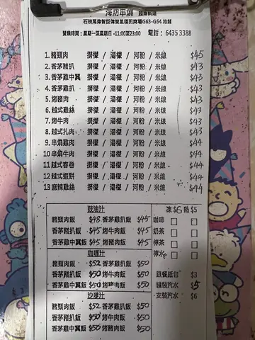 隐藏喺石硖尾屋村入面嘅小店,望落唔起眼,但出品非常之嘅令人惊喜。除咗一啲传统嘅越南捞檬同汤河之外,个人十推荐烤猪颈肉同烤牛肉饭。牛肉腌得非常之入味,而且烤得好嫩滑,一啲都唔会韧,肉嘅份量亦都俾咗好足料。如果嗌饭嘅话仲会有一只煎糖心蛋同招牌葱油淋饭上面,很是惹味。记得嗌老板娘帮手加多啲葱油,我觉得系呢个饭嘅精髓。小店嘅座位唔系好多,除咗几个露天嘅座位之外,隔离有间好细嘅屋仔入面都有啲位可以坐。但系始终系屋村小店环境一定系冇咁好,主要都系食佢嘅味道。