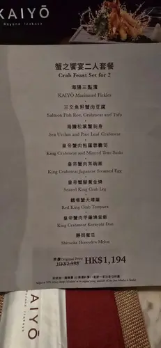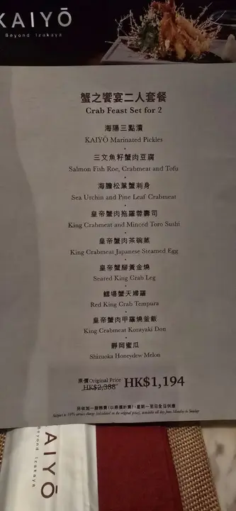 今日系女朋友生日,当然要带佢食好西!专登订咗尖沙咀「海阳」居酒屋个蟹之飨宴二人套餐,原价$2368而家做紧$1194,即刻觉得赚咗!💰海阳三点渍打头阵,腌得酸酸甜甜好开胃,我哋已经急不及待等下一道!三文鱼籽蟹肉豆腐简直系视觉享受!金黄鱼籽卜卜脆,蟹肉鲜甜,豆腐滑溜溜😍海胆松叶蟹刺身一上枱我哋哗哗声!海胆creamy到极,松叶蟹肉鲜甜到震,个搭配真系无得顶!皇帝蟹肉拖罗寿司超豪华!蟹肉一丝丝咁铺满成件寿司,仲要加埋拖罗蓉,入口即化,正到难以形容!🍣皇帝蟹肉茶碗蒸蒸蛋滑到不得了,蟹肉鲜味完全渗入蛋入面,每一啖都系享受~皇帝蟹脚黄金烧系全晚高潮!蟹脚大大只,烧到金黄色,蒜香浓郁,肉质饱满弹牙!🔥鳕场蟹天妇罗炸粉超薄,蟹肉依然保持鲜甜多汁,点埋天妇罗汁食,香脆而不腻~压轴出场嘅皇帝蟹肉甲罗烧釜饭不得了!即烧蟹膏蟹肉香气扑鼻,捞匀饭食每一啖都系浓郁蟹香🦀最后以静冈蜜瓜作结,清甜多汁,完美结束呢个蟹宴!成个晚餐食足两个钟,每道菜都高质,服务又周到,环境有格调。女朋友话系今年最满意嘅生日饭!虽然价钱唔平,但一年一次生日,绝对值得豪一次!❤️…查看更多