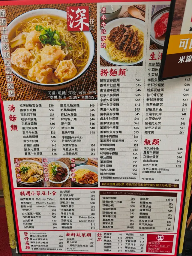 //14 08 23 晴天🌞13:44 旺角 砵蘭街深仔記/ 有錢人先會食細蓉 /「香港」五十年代興起露天大牌檔熱潮🪭,一塊大大嘅招牌、一片綠色嘅蓬布頂、積滿塵垢嘅牛角扇、一張又一張標誌性嘅圓枱同摺凳。相信,只要年過四十,都一定幫襯過。但唔知由幾時開始,大牌檔就漸漸成為香港人集體回憶!當中有款價廉物美嘅麵食,到目前為止,仍然深受大批市民嘅愛戴💖。「雲吞麵」—— 出現於清未民初,從湖南傳入廣州,一般按份量分為「細蓉」、「中蓉」同「大蓉」。雖然聽起嚟,你會覺得無太大嘅分別,但喺民初時期,「細蓉」確實只適合「西關大少」—— 富裕人家享用。好少體力勞動嘅「西關大少」,胃口自然比一般人細,當每次食雲吞麵,都會主動要求店家,將麵嘅份量減半。但對於勞碌嘅百姓,份量確實太少啦😔,所以只能將「細蓉」作為點心或者宵夜。/直到今日,香港每個大街小巷,都能見到「雲吞麵」嘅蹤跡💁🏻‍♀️。無論十三歲定八十歲嘅你,至少都一定品嘗過一碗滿滿情懷嘅「雲吞麵」啊!#90後眼中的老香港-淨雲吞 HKD$34—————————————————————————雲吞皮薄 蝦肉夠大隻 食起嚟口感爽嫩每粒都以 7:3 比例嘅蝦 & 豬肉做餡料湯底用咗金華火腿、大地魚、羅漢果等材料熬製所以每啖都帶有大地魚嘅甜味 & 蝦肉嘅鮮味零味精 飲完唔會覺得頸渴但有輕輕鹹 不過唔太影響整體嘅味道麻辣黑牛柏葉湯撈面 HKD$56—————————————————————————黑柏葉爽口 配埋辣油醬 & 薑葱非常惹味麵底彈牙 有嚼感 鹼水味一啲都唔重麻辣鵝腸 HKD$33—————————————————————————鵝腸火候控制得好好 食落去爽口而不靭,兼且絕無異味配埋麻辣醬 & 薑葱 鵝腸鮮味會更加突出—————————————————————————查看更多