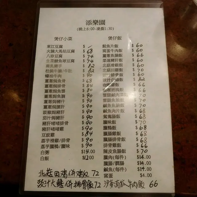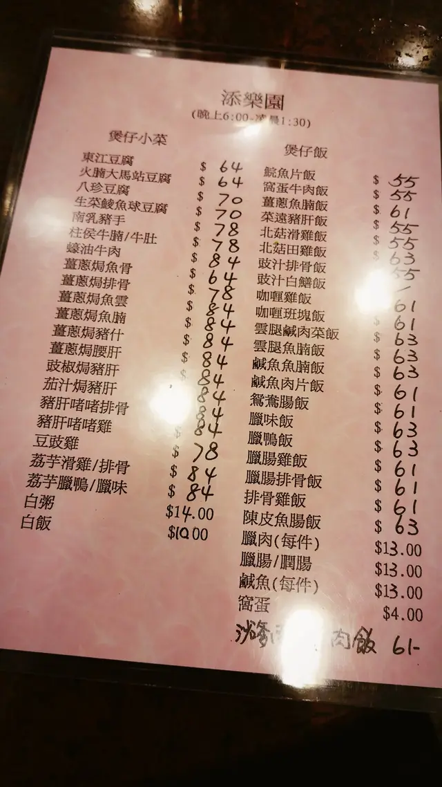 我很喜歡吃煲仔飯,每到秋冬天的時候,我便會來到這這間餐廳吃煲仔飯,這裡的煲仔飯選擇非常之多,除了一般的選擇之外,也有一些外面餐廳少見的菜式,例如我至愛的魚腸焗蛋煲仔飯,這裡做得非常之好,魚腸味道香濃,蛋味濃郁,飯焦惹味香脆,再配以潤腸或者臘腸來吃,味道非常之好。這道煲仔飯是我在外面其他餐廳沒有見過的,也是我每次來這𥚃必選的煲仔飯菜式,另外這裏的麵食也是很不錯,所以每到九龍城的時候,我必定會光顧添樂園這餐廳,絕對是一件窩心的事情。…查看更多