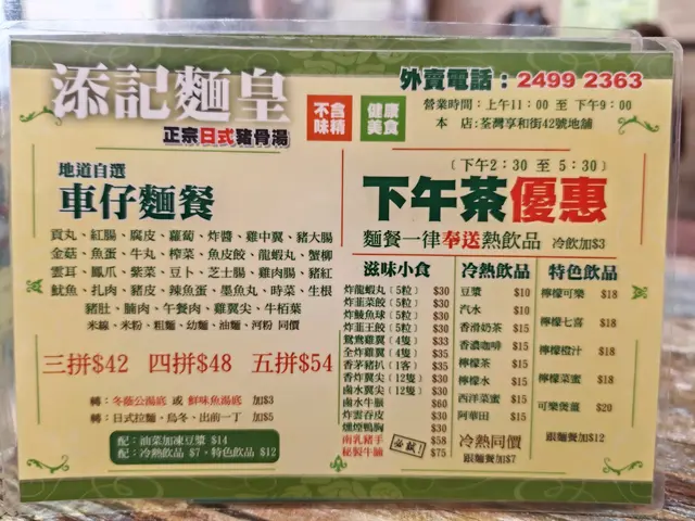 添記麵皇 (荃湾) 网址: https://s.openrice.com/QrLS09d0800 地址: 香港荃灣享和街42號地舖 电话: +852 24992363