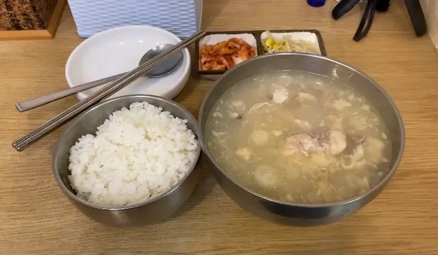 紅磡一向有唔少食街,呢間位於湖光街中間嘅清溪川雖然鋪頭細細,但都有好多堂食同外賣客,lunch hour想坐低都要預返少少時間🙈等咗20分鐘後有位,即刻叫個人參雞湯試試($60),見到韓國老闆娘好用心招呼客人、打理樓面👍🏻大大碗湯熱辣辣嚟到,估唔到真係有好多雞,以為煲咗咁耐一定好柴,但竟然仲有少少嫩、唔會覺得咬緊紙皮🤣而且成舊雞都煮到骨肉分離,一咬就撕得開真係好正🥰亦因為咁所以有唔少碎骨,雖然啲骨其實都煮到咬得爛,不過食嘅時候最好都係小心啲😛湯頭冇咩人參味,反而係濃郁嘅雞湯,又唔會太杰身或者太膩,所以就算食曬啲飯齋飲都好正😋每人都有兩款前菜 - 泡菜同芽菜,味道質感都係預期中😌查看更多