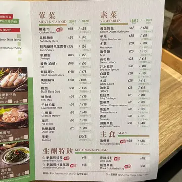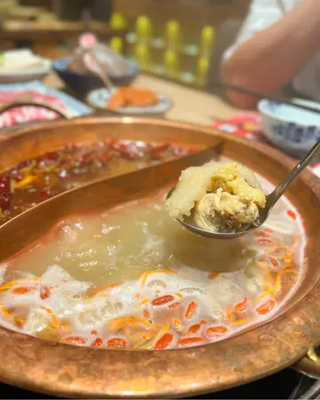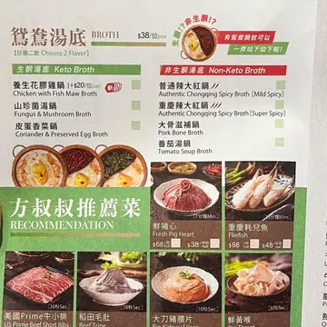 🍗养生花胶鸡汤 重庆辣窝 鸳鸯锅底 🍜花胶鸡汤系生酮汤底,无味精,啖啖都系鲜味,健康得黎又补身。花胶有两条手指咁大只,绝对足料!听厨房讲,用料用上三黄脚,肉质嫩滑,皮脆骨软,味道鲜美。肴制足6小时,肴至皮散胶质溶于汤中,胶质十足。另一边,重庆辣窝,未上盘都已经闲到!超重牛油味,加上数不尽的大辣椒!眼口鼻舌都感受得到的冲击!配合埋蒜、葱以及麻油做一个干碟,一来就可以降温,二来更加可以增加香味。🍯二十多款生酮食材🍗以为生酮都系食得好闷,但原来唔系!二十多款食材,包括美国Prime 牛小排,十秒食得,油脂入口即化!稻田毛肚,配辣窝系一绝,爽口又入味!麻辣牛肉,好少地方有得食,平辣椒片包著鲜牛肉,一口入魂!…查看更多