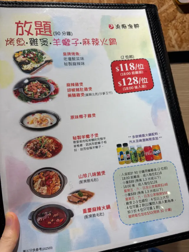 為食🐑近期食過性價比最高(沒有之一)嘅任食雞煲火鍋❗️放題(90分鐘)!🐟烤魚•雞煲·羊蠍子·麻辣火鍋💰每位$118❗️(6點前離座) / $128❗️(6點後 / 2位起)先揀一個煲,為食🐑當然揀麻辣雞煲啦🔥🐔!雖然價錢好平,但味道一啲都唔馬虎~麻辣兼備,香濃惹味,雞肉都唔會太嚡,仲幾嫩滑㗎!最正係勁多火鍋配料任你揀,包括牛肉、豬肉、魷魚、各式丸類、蔬菜等等,真係應有盡有!仲有汽水、前菜、飲品全部任飲任食,真係超抵!令我最印象深刻嘅係:❤️韭菜豬紅 — 麻辣香口!💚炒油麥菜 — 鑊氣十足,味道濃郁!🍮甜品方面仲有中式糖水添,真係由頭滿足到尾!呢個價錢,絕對係我食過最抵食嘅雞煲任食!🤎滷水鵝肉 $98原來呢度除咗雞煲之外,亦都好出名做潮州菜式!所以叫咗個滷水鵝試吓~味道香醇濃郁,肉質滑嫩唔韌,滷得夠晒入味,質素竟然有驚喜!本身都好想試埋蠔仔粥,不過實在太飽啦,下次一定要再嚟試!✨呢個價錢食到咁多嘢,全部嘢都OK唔難食,有幾款味道仲幾好添!如果你要求唔高,但又想大滿足,一定好似我哋咁食得咁開心!σ`∀´)σ…查看更多
