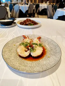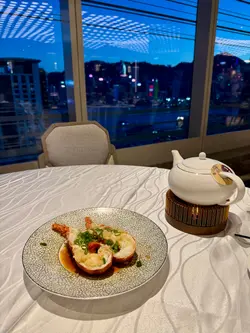 酒楼在国际广场高层,坐拥270°维港海景,尤其是华灯初上的傍晚,中环的灯色特别熣灿夺目。酒楼装修高雅华丽,枱与枱的空间阔落,坐位舒适。茗茶用慢火保温,相当贴心。很多酒楼都有特惠晚餐菜式,这里也不例外,我便点了超值龙虾。「金银蒜蒸开边本湾龙虾」