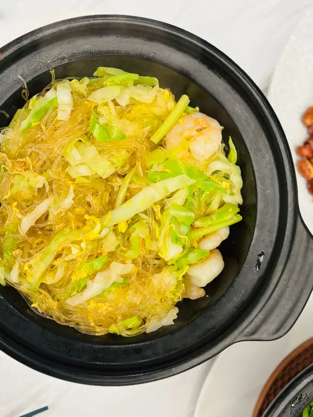 粉絲幼身,炒得乾爽香口,鮮香粉味,少有一次過吃到3種不同口味的蝦,每隻蝦同蝦米彈滑爽脆,特别濃香鮮蝦鮮味大澳蝦乾唐生菜煲