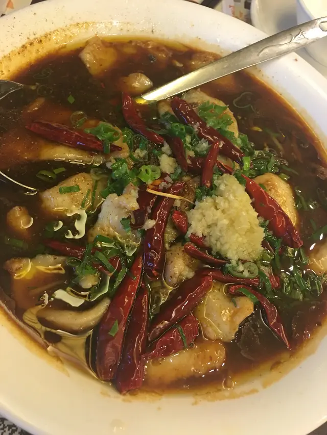 。打開餐牌決定要一個水煮 。。什麼都可以。 又想吃雙色魚頭但只得兩個人且要慢慢嘆食吓骨, 最後還是選了水煮魚片。一大盆水煮魚片紅噹噹的非常搶眼!賣相超吸引 ,即時食指大動。 看見表面灑上一些生蒜, 把它和湯底隨隨混合, 味道又提升了。魚片很厚肉,問了部長是什麼魚片,原來是龍脷柳, 怪不得肥厚肉多且不容易夾散。 這個水煮魚應有的味道都齊, 麻辣得來有鮮香帶辛辣, 那些花椒辣椒油燙燙的包著的魚塊會令你越吃越想吃
