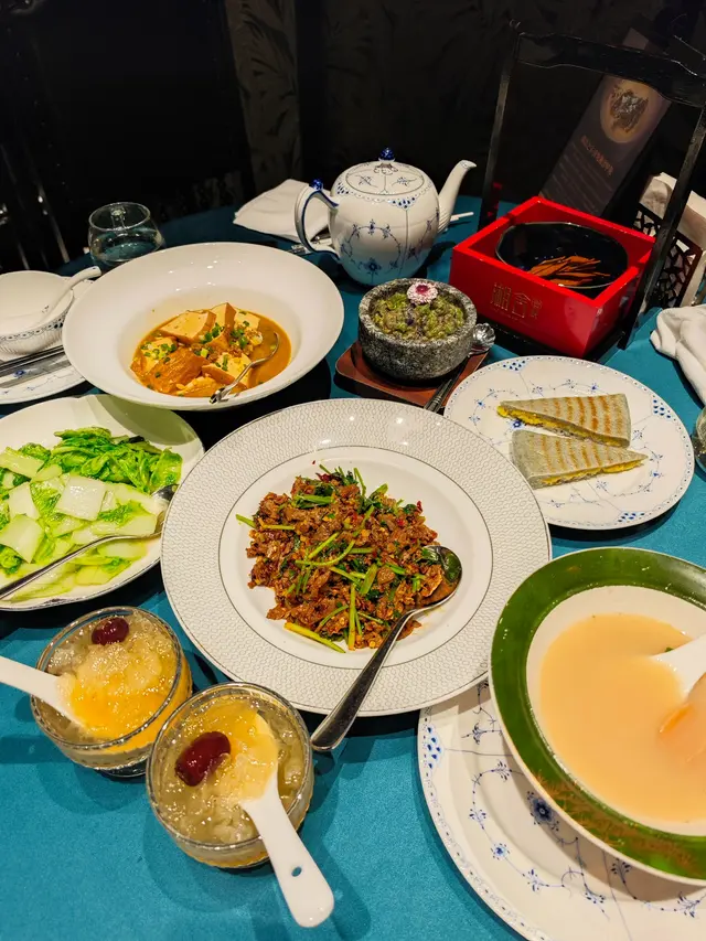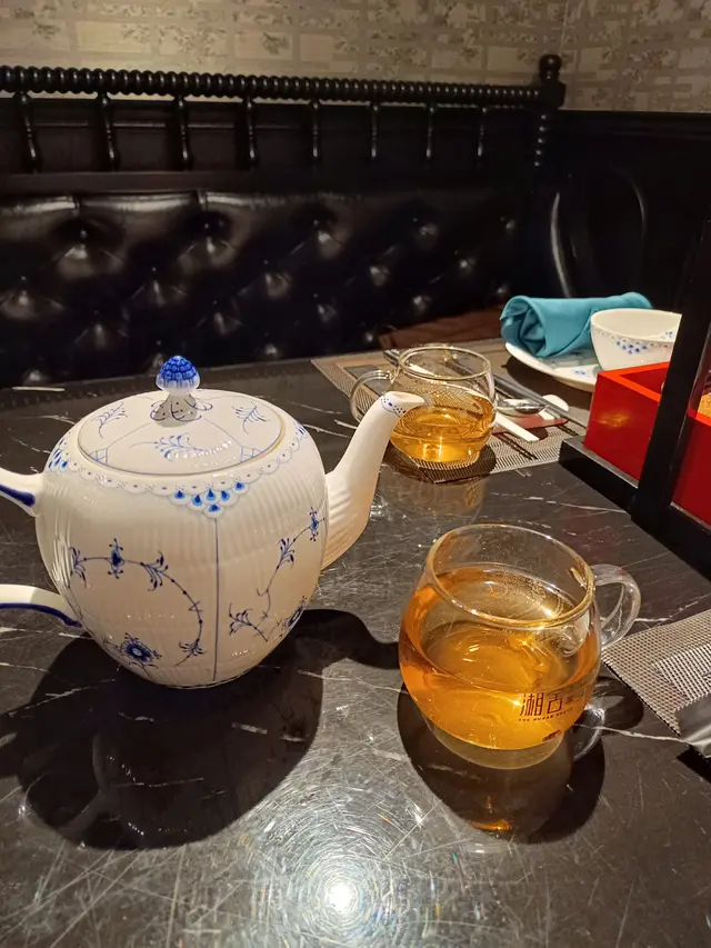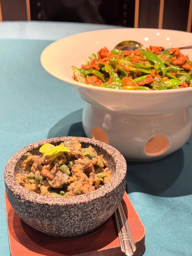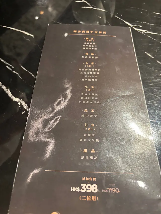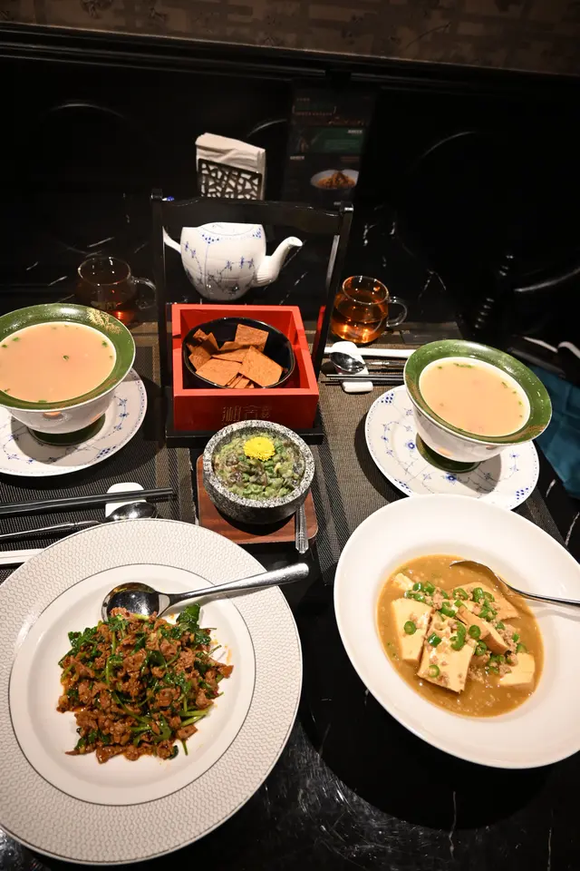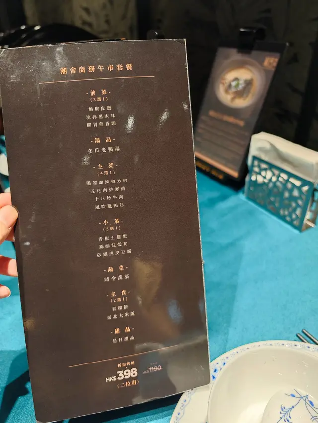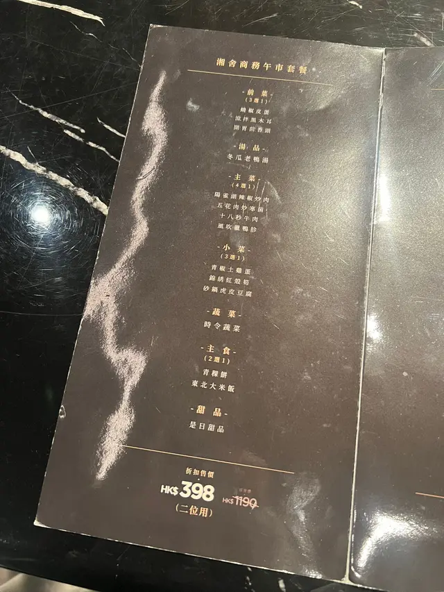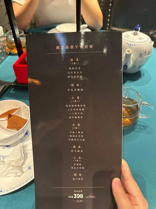 今日再次邀請工作夥伴,在灣仔某高級酒店內享用湖南風味的午市湘菜套餐。餐廳以黑、白、灰為主色調,設計簡約大氣而不失格調,空間寧靜舒適,設有包廂和掛簾,極具私密性。這次的商務午市套餐($398 / 兩位),以湖南家常小炒為主軸,選材精緻不鋪張,火候講究,展現出湘菜獨有的層次與風味。我們的搭配如下:- 清茶:陳年普洱,入喉溫順- 前菜:燒椒皮蛋 香辣燒椒與滑嫩皮蛋一同樁碎,香氣撲鼻,辣而不燥,開胃十足。- 湯品:筒子骨燉湖藕湯 清潤濃郁,湖藕鬆軟綿密,滋味醇厚。- 主菜:18秒牛肉 採用湖南經典「快炒」手法,牛肉片在大火中迅速翻炒十八秒,保持鮮嫩多汁,搭配芫荽香氣撲鼻,口感爽滑,香辣有致。- 主菜:錦繡紅鶴筍 紅鶴筍清脆爽口,臘肉粒鹹香濃郁,青椒微辣提味。- 蔬菜:清炒椰菜,清甜爽脆- 主食:小米青稞餅 外酥內糯,口感樸實。- 甜品:銀耳蓮子羹 滋潤養顏,銀耳軟糯,蓮子綿密。…查看更多