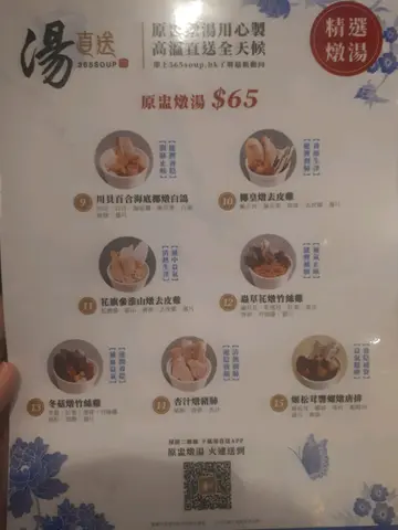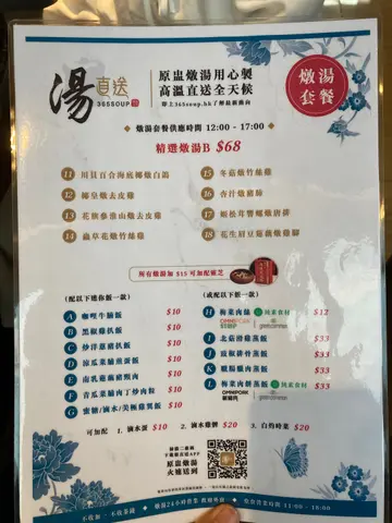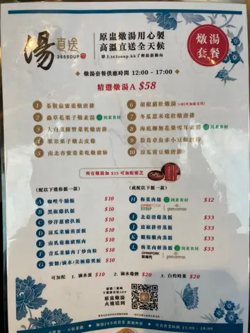 。餐枱好干净,有纸巾同消毒液畀大家用。午市餐牌有成18款炖汤选择,每款58-68蚊,然后加10-33蚊可以加配一款饭﹐饭頪都有成12款选择。等左10分钟,4盅汤上齐,影个大合照先