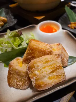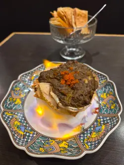 。富士山火焰带子烧,又系店铺招牌菜,上桌后侍应会点埋火,带子经火炙烧后表面微焦,内里保持半生熟状态。酱汁系灵魂所在,蛋黄酱烧焦后嘅焦糖香同带子好夹,同埋加入好多配料,口感层次更加丰富