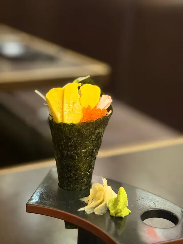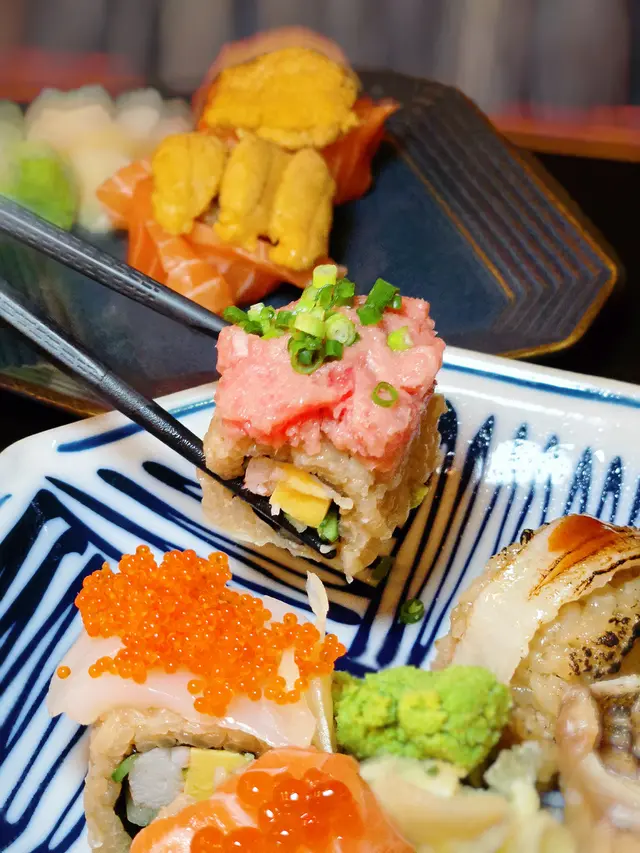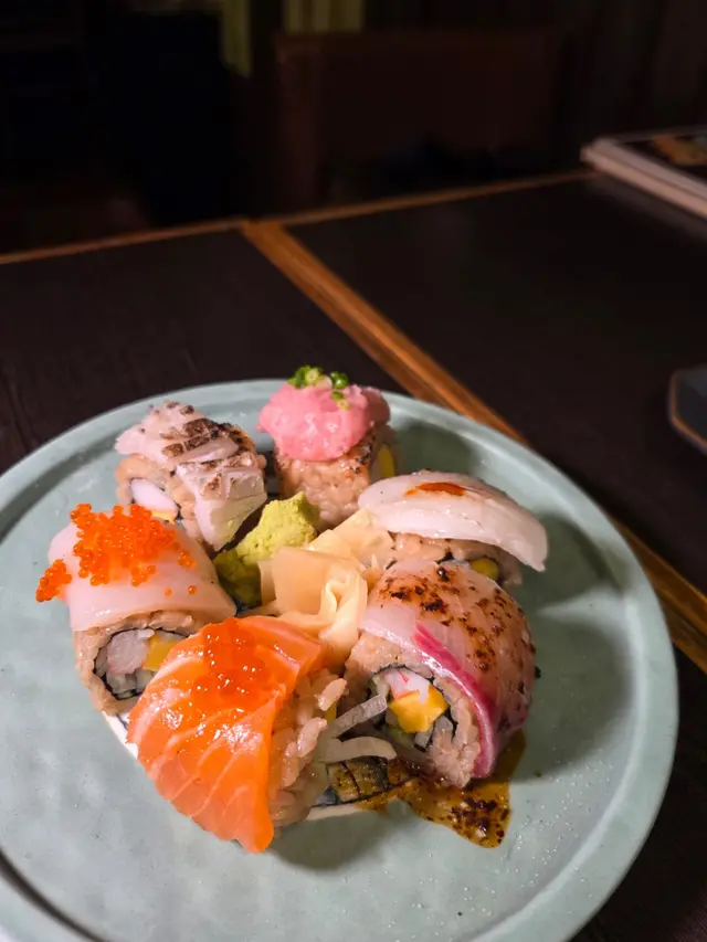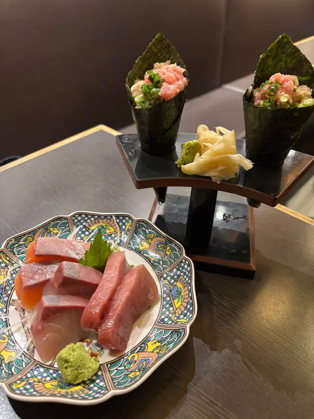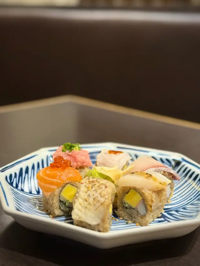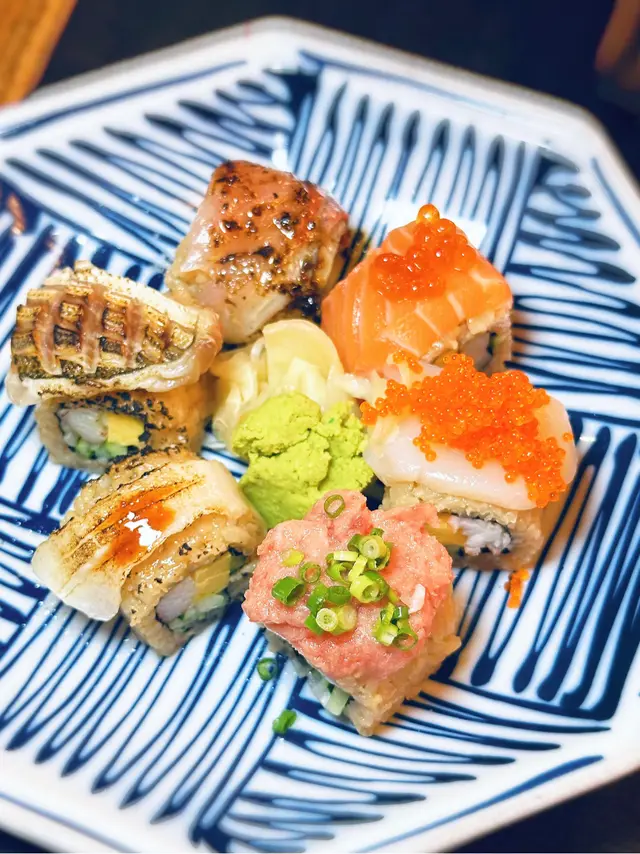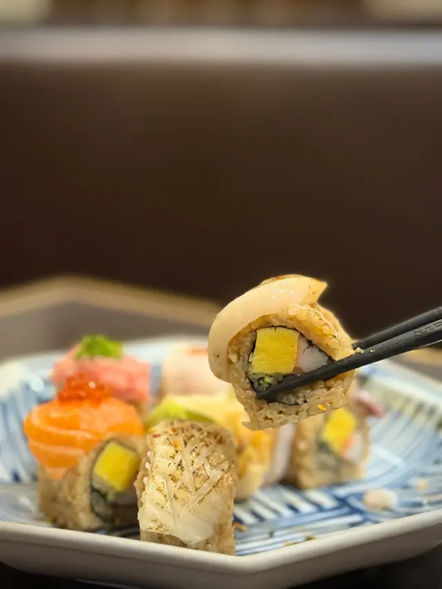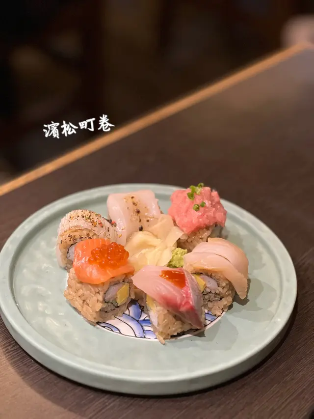 。濱松町卷,一碟六件壽司好似個花環,真係好靚。刺身係每日新鮮飛機貨,帶子鮮甜軟糯,三文魚油脂甘香,燒左口魚邊微微焦香,醋飯調味溫和,酸度輕柔,完美襯托魚生鮮味
