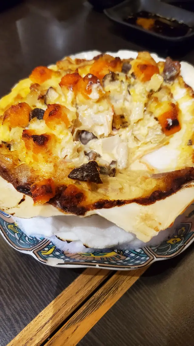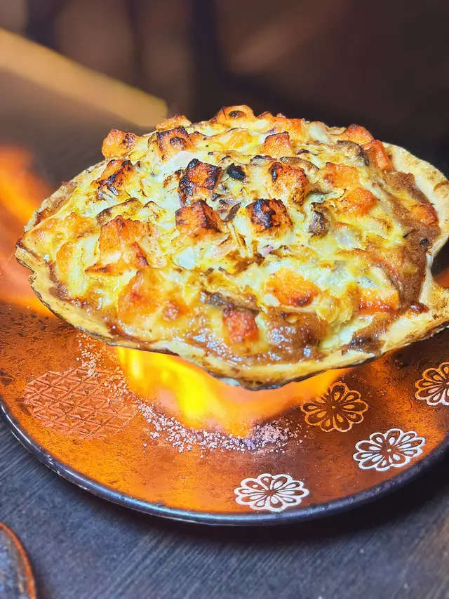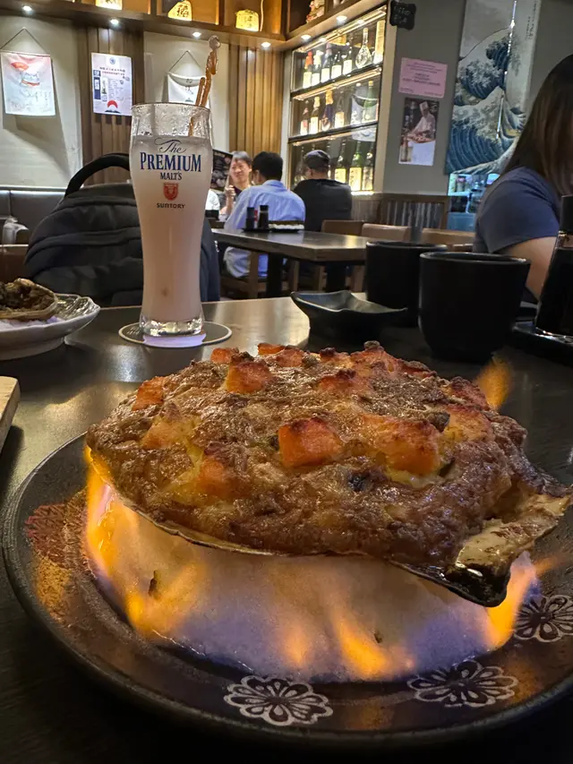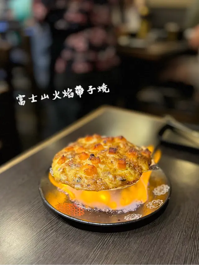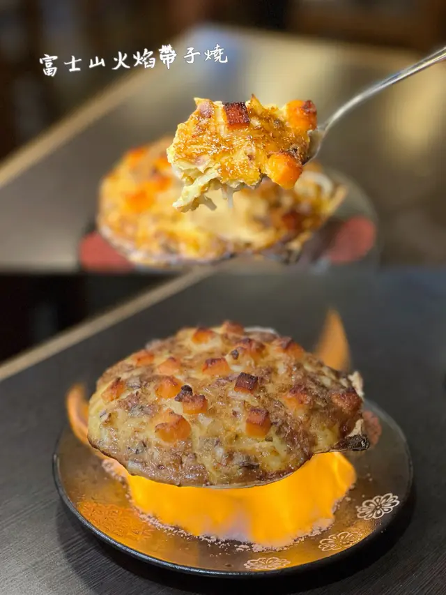 。富士山火焰帶子燒,又係店鋪招牌菜,上桌後侍應會點埋火,帶子經火炙燒後表面微焦,內裡保持半生熟狀態。醬汁系靈魂所在,蛋黃醬燒焦後嘅焦糖香同帶子好夾,同埋加入好多配料,口感層次更加豐富