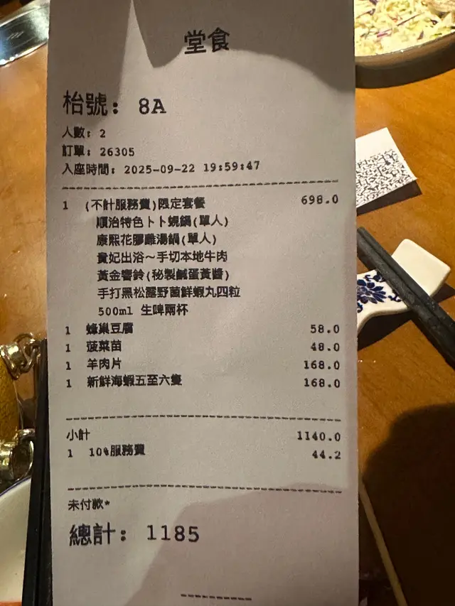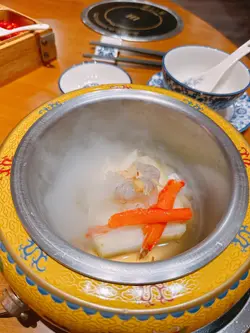 餐厅浓厚的宫廷风格贯穿每个细节,从雕花屏风、红灯笼到仿古摆设,营造出华丽而有趣的氛围。特别设有宫廷服饰及龙椅供客人拍照,打卡效果一流,连餐具也精心选用龙纹锅与镀金器皿。午市一人锅设计几贴心,可以自由选择心仪汤底,干净卫生。餐厅强调每日新鲜熬制汤底及手工制作饺子、丸类,实际体验亦能感受到真材实料。🥢康熙花胶鸡汤底:汤色金黄浓郁,花胶软滑,鸡汤鲜甜不腻,涮食材前先喝一碗十分满足。🥢顺治特色卜卜蚬锅:蚬量充足,汤底带蒜香与清酒气息,海鲜风味突出。试了两款套餐,整体分量充足,食材配搭见心思:珑套餐:日本A5黑和牛油花均匀,轻涮数秒入口即化;手打黑松露野菌鲜虾丸松露香气足,虾肉弹牙;紫皇蟹粉豚肉饺蟹味浓郁,值得一试。鼎套餐:伊比利亚橡果猪肉质甘香,手打紫薯流心猪肉丸创意十足,芋泥猪肉饺绵密香甜,日本蟹柳与风琴豆腐吸汤能力强,入味非常。🥢套餐已包饮品,无糖可乐搭配清爽解腻。🌟餐厅以独特的宫廷主题打造出别具一格的用餐体验,无论是午市独自享受一人火锅,还是与同事共进商业午餐,都可以找到满足感。…查看更多