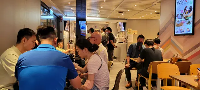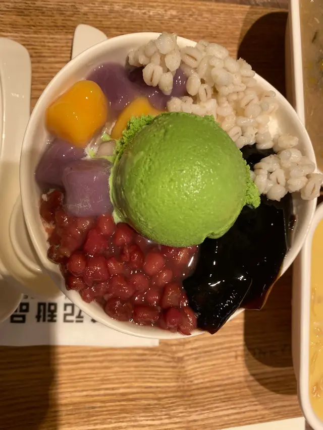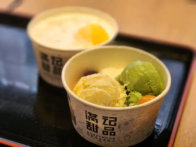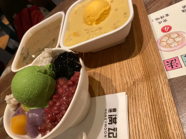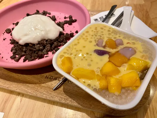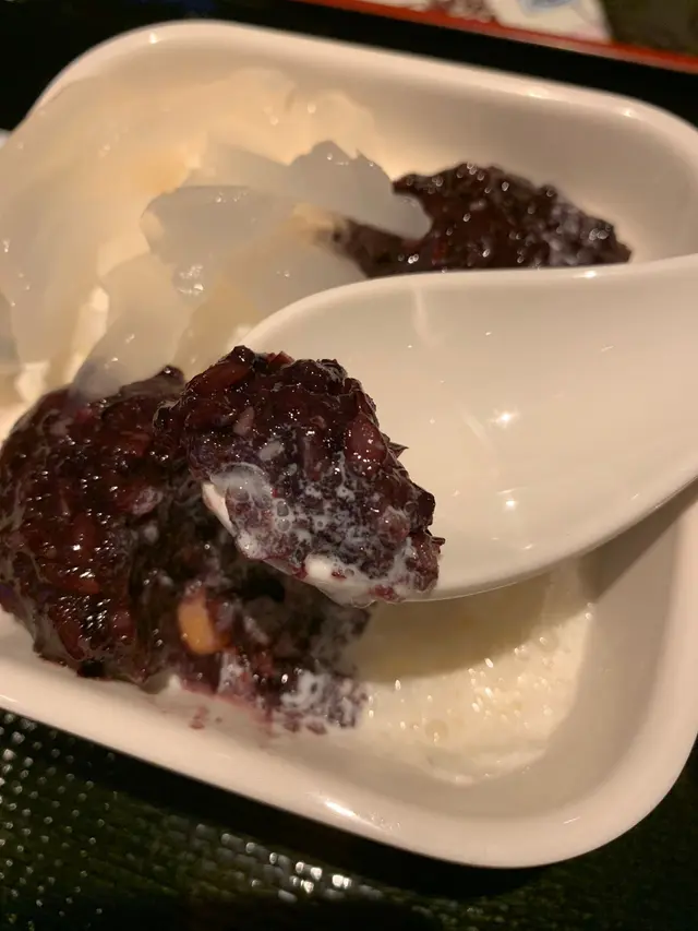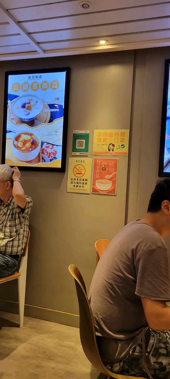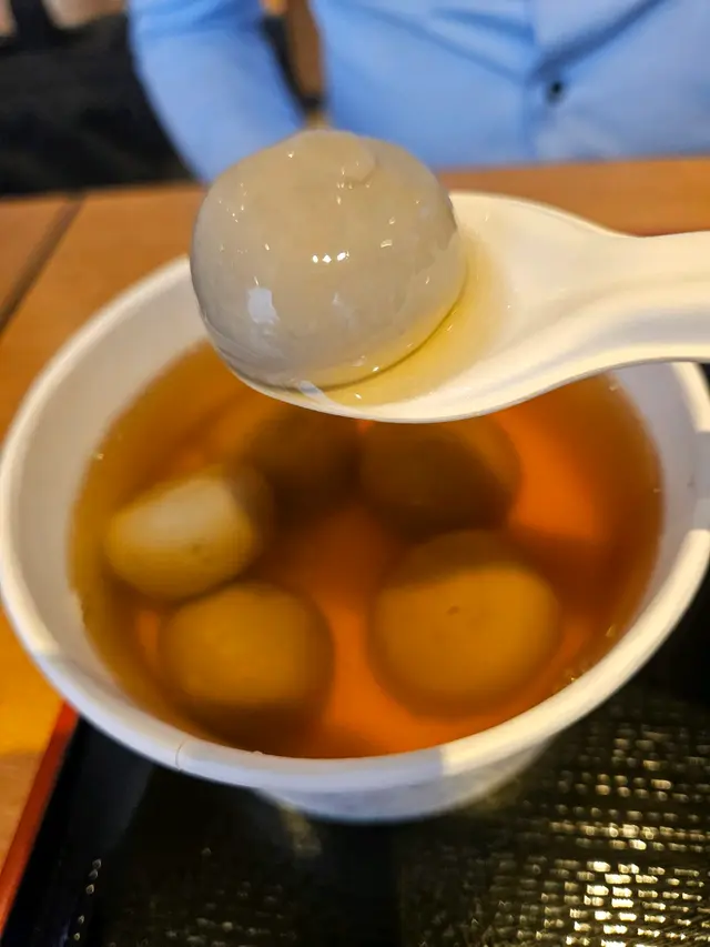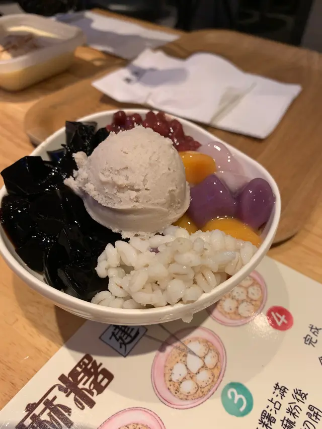 透明晶瑩的桃膠,有軟身的亦有爽口的!芋圓、地瓜圓、紫薯圓,口感煙韌!芋圓的芋頭味輕滲,地瓜圓味道最輕微,完全被薑味掩蓋了!:(恰巧!店內最盡頭,有位靚女食客正在向女友人哭訴失戀!或多或少都會影響全場氣氛,她朋友拿著電子儀器出去準備領取食物時,怎料到,男店員拿整盤甜品給她們,實在窩心的服務!值得一讚!