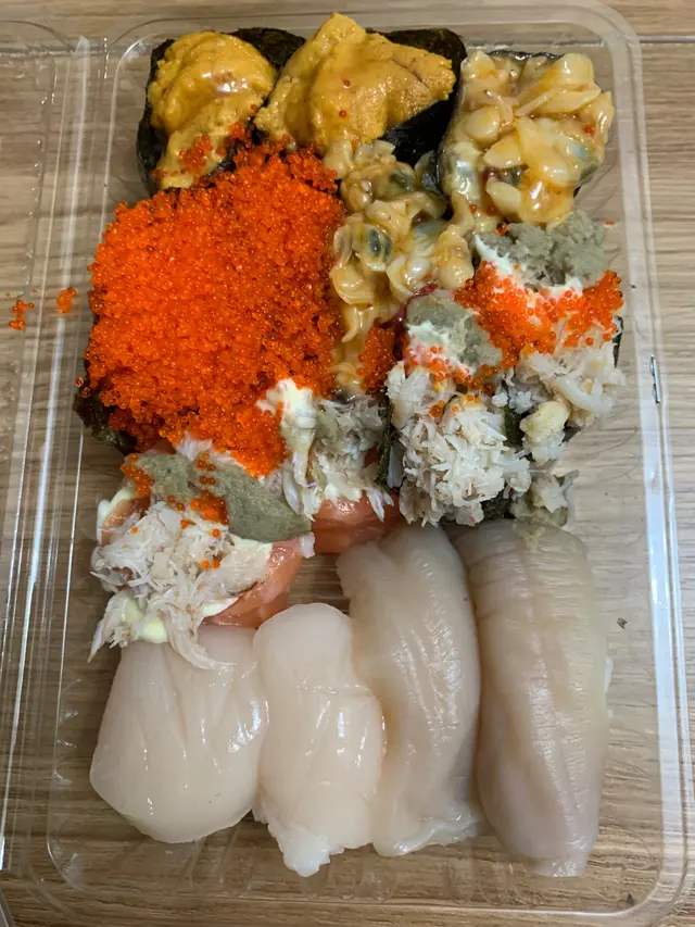 之前在這裡試過生蠔🦪不錯,因為對即制手握壽司情有獨鍾,今次試試外賣壽司想不到成就解鎖。壽司師傅神乎奇技將 14件壽司🍣 拼埋做一個魚生飯盒(如圖),其實如果外賣盒好貴可以同客人講外賣加 2蚊,我相信大部份客人都唔介意既,如果貪平就去爭鮮啦!件壽司又唔駛返工,唔駛搞到好似朝早迫地鐵咁既 😅😅😅如果當佢係丼飯咁食風味又不同了,日本帶子鮮甜,日本海膽新鮮軟滑無腥味,蟹肉蟹糕辣螺肉味道也不錯,整體用料新鮮價錢公道。查看更多