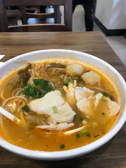 嗯,第一次吃渔粉,原来系用五谷米线作的,米线很滑溜。汤底我点了个麻辣汤,汤底够麻够辣,(觉得不够的话可以在调味盘中自己加哦。)汤底应该是用海小鱼加猪骨熬制的,能喝到汤中有鱼汤的鲜味和猪骨汤的味道(据我多年的食汤粉舌头👅可以饮到出来)。喝了也没有口渴的感觉。我加了餐肉,但米线本了就有大量豆芽。米线是真的做得真不错,不是那种粗米线,是幼米线,但又不会煮的很烂。正宗的:细,嫩,滑