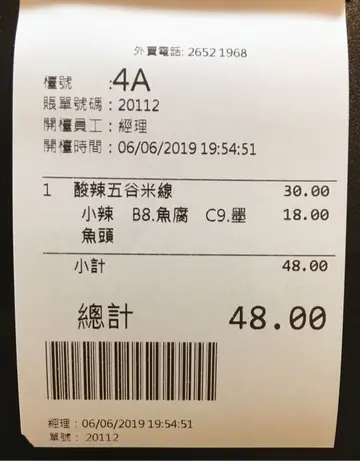 餐厅冷气不足,酸辣五谷米线30元,选了小辣,配菜鱼腐8元、墨鱼咀10元。汤底轻微辣,有酸味,除此之外,无其他味道。米线太软身。墨鱼咀不爽脆。鱼腐大大件,味道正常,口感很好。冻柠茶正常。推广期内惠顾两款配菜送冷/热饮品。