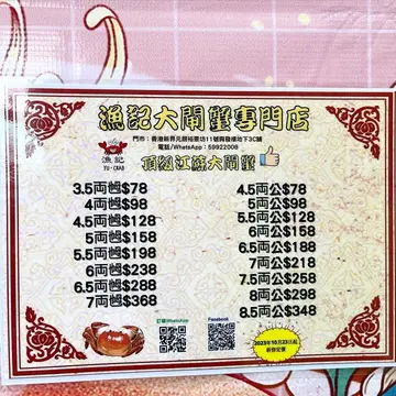 📍 渔记大闸蟹专门店 (元朗)元朗裕景坊11号兴发楼地下3C号舖-在OpenRice上发现一家新开的大闸蟹专门店,看到评价都很好,因此决定亲身体验一番!这正值11月,也是大闸蟹盛产的时节。我挑选了两只重5两的公蟹,并得知店主建议将这个重量的蟹反转后,加上紫苏叶,蒸20分钟即可享用。店员非常细心地指导蒸大闸蟹的步骤,并贴心地提供了一张蒸蟹的方法图。蒸好之后,每只蟹都充满丰富的膏肪,白膏和黄膏都十分丰盈,甚至还有不少黄油流出,我和家人都品尝得非常美味!这家店的店头订单满$1200就可享受全港九新界的免费送货服务,非常适合和朋友一同分享美味!现在正是约上朋友聚一聚的好时机,一同品味这家大闸蟹专门店的美味!