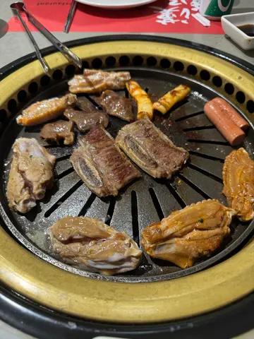 突然即庆儿时回忆烧肉团,一行四人去食汉和以前都系出去自己夹肉,事隔廿几年先再食。人大左, 口味唔同左,泡菜酸左d,酸到唔似泡菜。但都可以,会想继续食既。三文鱼仼食都几肥,而且应该可以,我金晴火眼望过😂黎到烧肉,当然要量产鸡翼,呢样我觉得系最好食!鸡扒控觉得因为鸡扒餣时上多左粉搞到易㶶,做唔到板烧鸡腿!姐姐换个烧板速度都快!烧洋葱又几好食!第一次食!记住呢到系食儿时回忆,要高质既再揾揾啦!出面大把韩烧店有靓牛。呢到系食任食,又雪糕又任食菜。