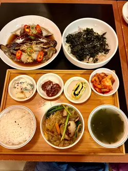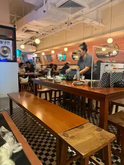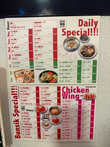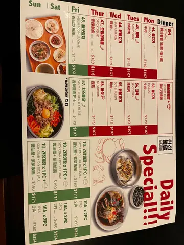 餐厅外嘅壁画好靓.Google search先知, 原来佢大有来头.佢系自2001年以嚟, 韩国原创餐厅之一.一入门就听到韩文歌, 好似去咗韩国咁!Menu劲多选择, 种类丰富.韩式小菜首先上枱嘅系经典韩式小菜.有泡菜、麻油芽菜同埋海鲜煎饼.Daily Special - 酱油蟹 + 紫菜饭团 (HK$171)而家Daily Special做紧优惠, 所以忍唔住叫咗.超正!只蟹浸满酱油, 蟹膏多到爆!味道鲜味, 带点微咸, 入口即溶.配埋加咗饭素嘅紫菜饭团食, 真系一流啊!甜辣炸鸡 (HK$99/半份)炸鸡都几大旧.皮薄, 食落脆脆哋.甜辣酱挂汁均匀, 唔会太辣. 下次要叫全份先得, 因为好想食薯条.汉城炒年糕 (HK$77)年糕口感烟靭.甜辣汁又唔会太辣.好惹味.仲有鱼糕同泡菜.好想攞嚟捞饭.整体嚟讲, 依间店嘅食物质素都唔错.环境舒适.想食酱油蟹嘅一定要过嚟试!不过想星期六或日晚嚟食, 建议早少少去喇.因为7:00pm开始餐厅已经满座喇.…查看更多