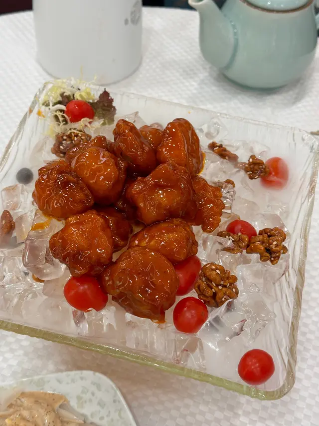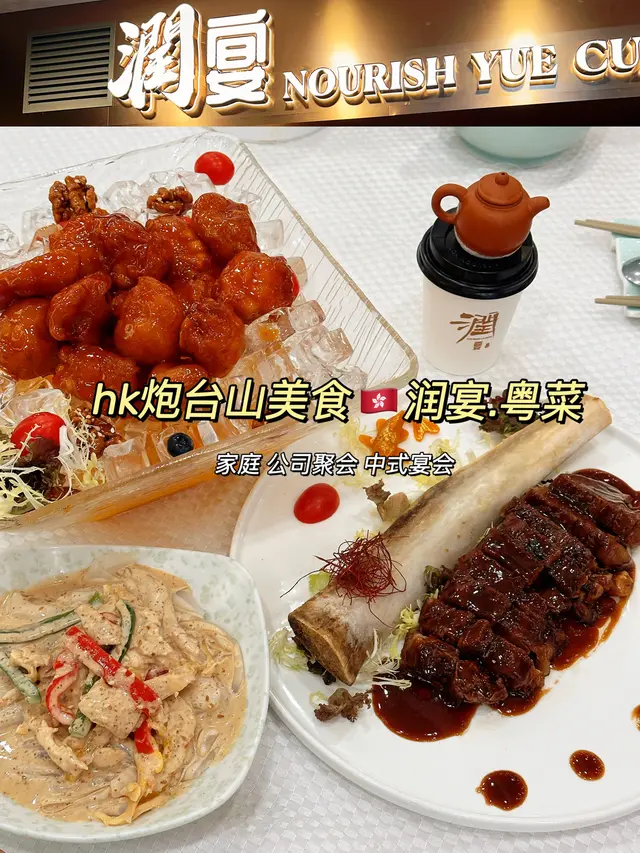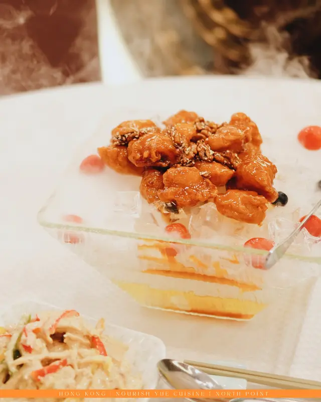 港島粵菜餐廳【潤宴】 近炮台山地鐵站,環境高檔,適合家庭/同事聚餐or宴會。🍽️冰鎮咕嚕肉招牌菜 剛出鍋的咕嚕肉放在冰面上,外層酸甜糖衣微微凝固,冰化的過程煙霧繚繞,帶來視覺和味覺的雙重衝擊。伴碟琥珀核桃甜甜脆脆,也做得很不錯🍽️秘制牛肋條也是招牌菜之一,肉軟淋而有纖維感。這種大肉菜很考驗調味,而這家廚師調味做得不錯,不同的香料組合配出特別的味道,和牛肋條很搭🍽️雞絲粉皮屬於小涼菜但份量不小,麻醬是日式煎焙芝麻醬,搭配手撕雞,不同於川渝麻醬涼皮,融合了港式的味道查看更多