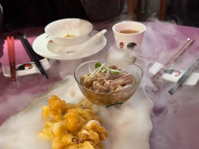 美味前菜三式( 右-鴨舌)(中-鹽酥脆鮮魷)(左-麻香拌海蜇)
