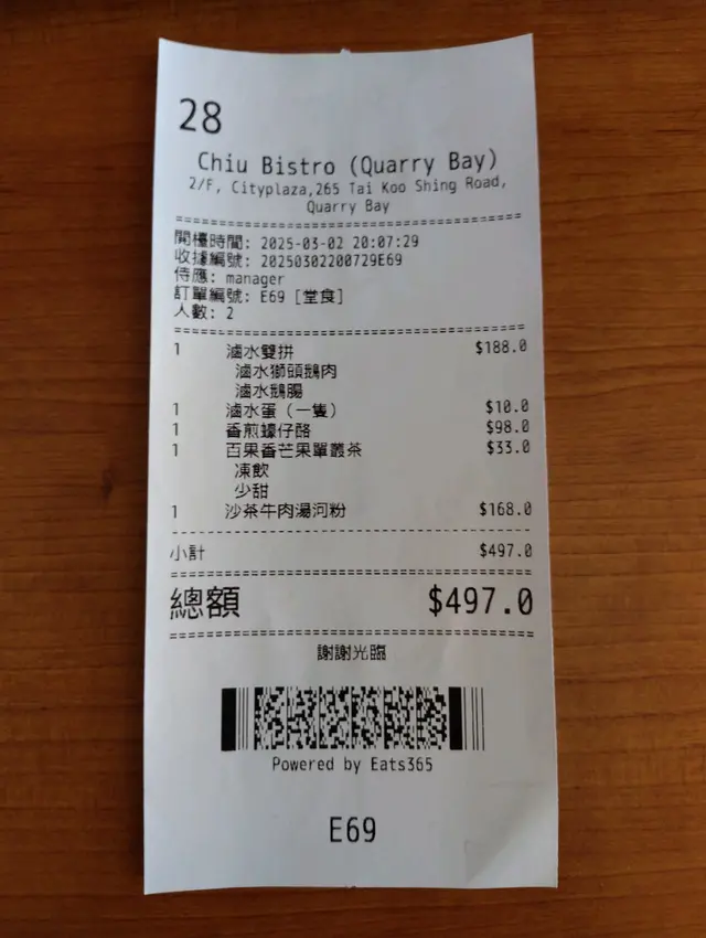 呢間潮汕大排檔,感覺好隨意舒暢,坐低就有種街坊味。太古城中心算異類😄滷水鵝片翼拼雞翼,味道夠鹹香,啖啖滷味,好啱濃味very like。牛三寶有筋腩肚,口感唔同層次,食落幾過癮。仲有隱藏菜,要問先知——春菜排骨,味道濃,算正常潮汕特色風格。其他餐牌菜酥炸普寧豆腐,自家製蝦蟹棗,滷水三拼,蠔仔肉碎粥,胡椒鹹菜豬肚湯,潮州風味炒河. 沙茶牛肉芥蘭. 沙茶牛肉芥蘭,下次再試。飲品方面,粉紅白傻豹朱奶泡沫滿,甜甜滑滑,幾出奇地好飲。咖啡唔你強,徧淡。整體感覺係:冇花巧,夠地道,食完有種「返到屋企」嘅親切感。 …查看更多