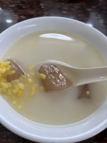 睇下个餐牌,原来已经唔经唔觉加到四五十蚊一碗糖水,虽然唔系特别平,但系都仲有好多人嚟帮衬,夜晚都好多人排队。呢个系热嘅腐竹薏米清心丸,佢啲腐竹好滑 同埋好绵,食得出去新鲜嘅腐竹,同埋佢唔会全部煲到溶晒,会留返啲一块块食到嘅腐竹,至于清心丸就好烟韧弹牙, 成碗糖水 有一个形容词好适合形容就系「唔系太甜」, 呢个系糖水嘅最高境界😂