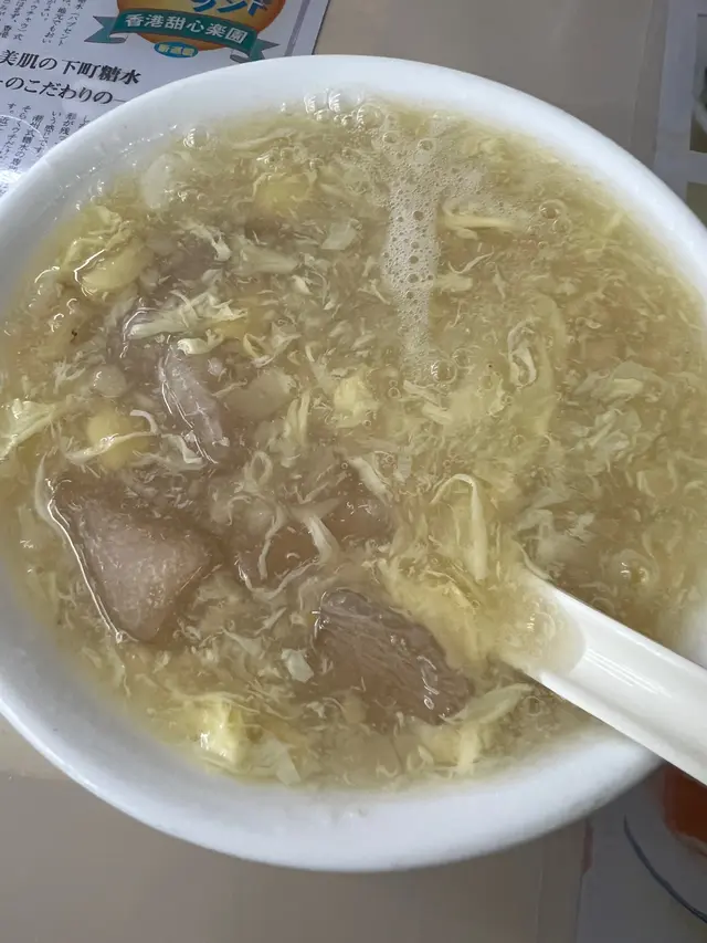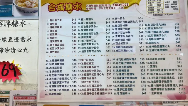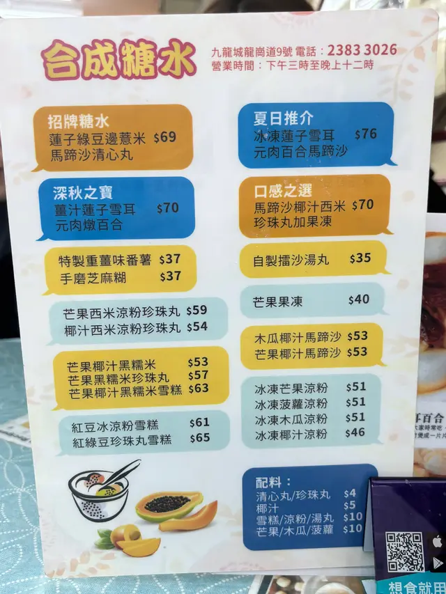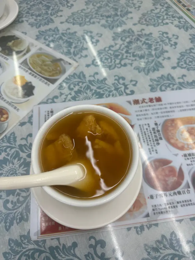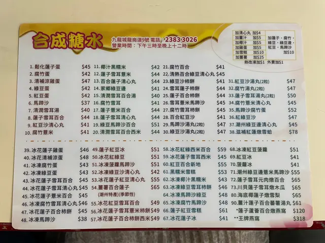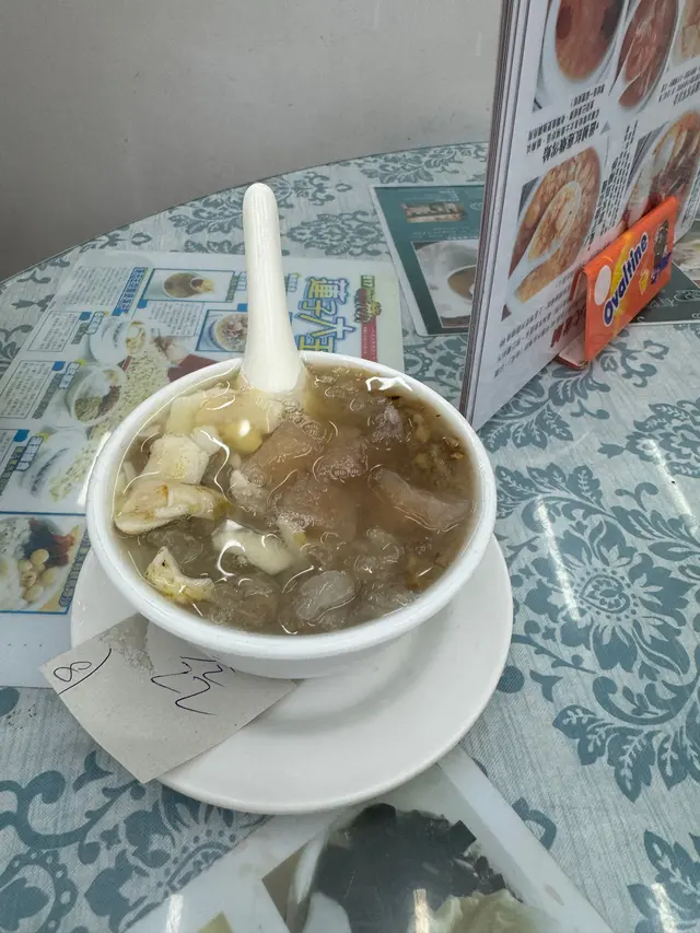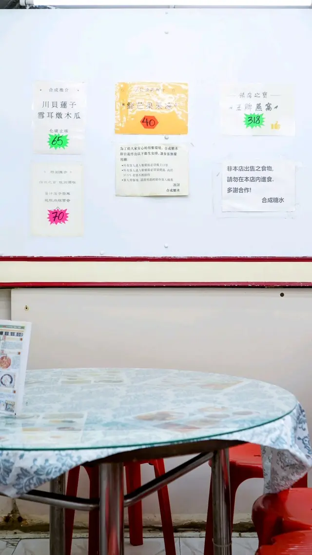 貴價潮式糖水 霖迪等级62024-11-172K 浏览 关注 【合成糖水】跟友人晚飯後意猶未盡,在夜啡與糖水之間選了後者。聽過潮州合成糖水好多次,不如趁此機會試試。如不少九龍城老鋪格局一致,非常傳統簡潔敞亮,位置被阿姐分配到樓梯底下,說坐這就不用搭枱,看來是種恩賜。雖然阿姐看來冷冰冰,但事實服務不差,會推介糖水坐久了也沒驅趕。接受阿姐的推介,選招牌蓮子綠豆邊薏米馬蹄沙清心丸$69。一直聽過合成評價毀譽參半,卻未有留意其價格也有點誇張,招牌糖水索價$69中式糖水界也屬少見,由於文迪甚愛馬蹄爽,所以就直接了當點招牌,朋友比我理智沒點招牌,就按口味選蕃薯糖水。招牌蓮子綠豆邊薏米馬蹄沙清心丸($69),說是招牌是因物以罕為貴?說真的除了是正宗潮式糖水外,味道其實沒有太特別。配料是多樣豐富的,但飯後甜品份量是太大了,馬蹄綠豆薏米十分平凡嚐不出分別來,甜味也未能融入其中,清水丸的特別口感仍有,但印象裏在其他糖水鋪遇過更出色的,而近來深圳人氣潮汕甜品糖閱蓮軒,味道亦可口親和得多。反而朋友的番薯糖水($37)較為正常,老薑香氣濃烈,蕃薯份量亦多。朋友說九龍城有另一家更平民美味,霖迪想若然非對潮式甜品有情意結,這家還是非誠勿擾了。潮州合成甜品九龍城龍崗道9號地舖#文迪漫遊慢生活…查看更多+ 1以上食记乃用户个人意见 , 并不代表OpenRice之观点。4分享貴價潮式糖水 潮州合成甜品 https://s.openrice.com/QrLT0J2DO00检举 Real Hongkonger 呢間掠水糖水!2025-02-05 回应 张贴 评分3味道3环境3服务3卫生2抵食用餐日期2024-09-04用餐途径堂食人均消费$50 (宵夜)
