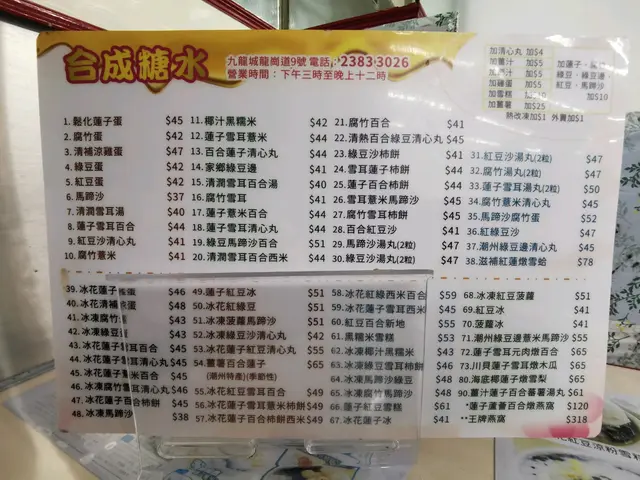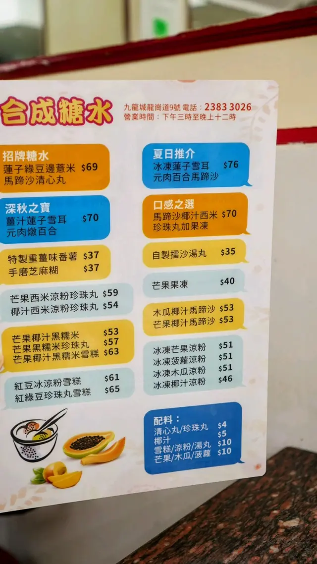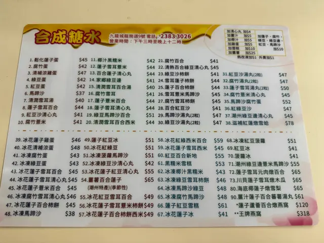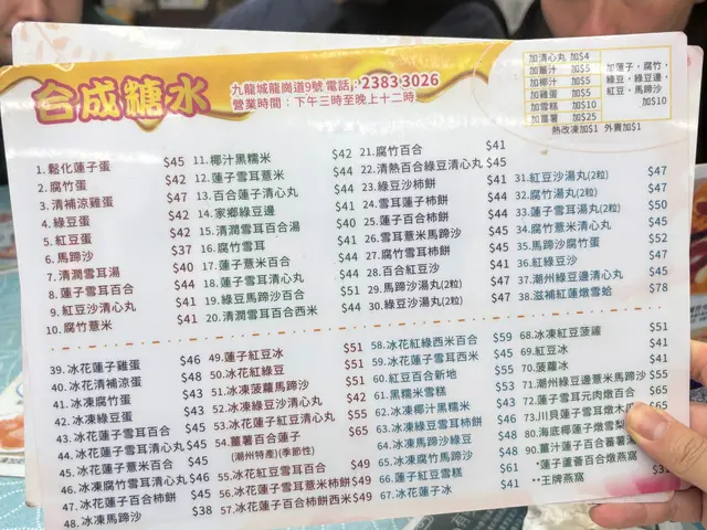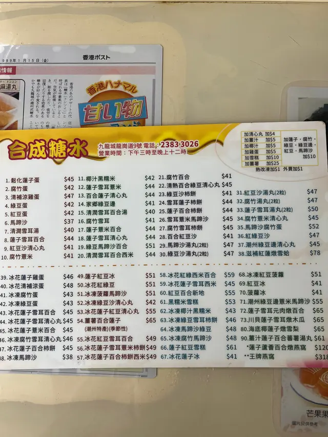 回憶的味道,非常珍貴 HK Food Miner等级42025-05-29716 浏览 关注 曾幾何時,九龍城係我食晚飯嘅熱點,而通常食完晚飯就一定會去合成食糖水。同其他糖水舖唔同,合成賣嘅係潮州式糖水,同食開嘅好唔同,我特別鍾意。今次咁啱出九龍城,一定要把握機會回味一下。呢度嘅糖水可以自由配搭、變化無限。我最鍾意嘅係馬蹄沙做底,再加啲我喜歡嘅配料。馬蹄沙綠豆邊加清心丸潮州綠豆邊薏米馬蹄沙呢度嘅糖水味道好清甜,感覺特別滋潤。唔同嘅配料有唔同嘅口感同味道,喺其他地方好難食得到。枱頭呢張剪報,原來已經有四分一個世紀歷史。順帶一提呢度下晝三點先開舖,唔好太早嚟!…查看更多以上食记乃用户个人意见 , 并不代表OpenRice之观点。赞好分享回憶的味道,非常珍貴 潮州合成甜品 https://s.openrice.com/QrLT0I7vS00检举 张贴 评分4味道2环境3服务3卫生3抵食用餐日期2025-05-21用餐途径堂食人均消费$53 (下午茶)