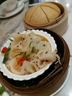 之前朋友生日吃过这店晚餐。今天同家人去完柴湾后,来试下下午茶。我们三人吃了不少点心。。。。不得了,竟吃得返以前香港有名的金x潮州酒家的点心。尤鱼。香气扑鼻。肉质弹牙。牛栢业。味道香港第一。份量十足。虾饺。皮佳内丰。吃足两笼。烧卖。虾大。肉鲜。鹅片拼鹅肠。肉质系我吃过最好。味道不太浓,正合我意。鹅肠更要大赞,清洗得好干净之余,连内部的肥膏也清走。好健康。特别提下大家吃鱼干菜甫等前菜时,不忘叫个白粥。。。。直情是天地之合。这里的甜品也中上水准。这店装修好美,好特别。摆设好高贵。而且有2贵宾房,房好大。这里星期1-5的下午茶更是不收茶$.....单据又清楚。一定再来。