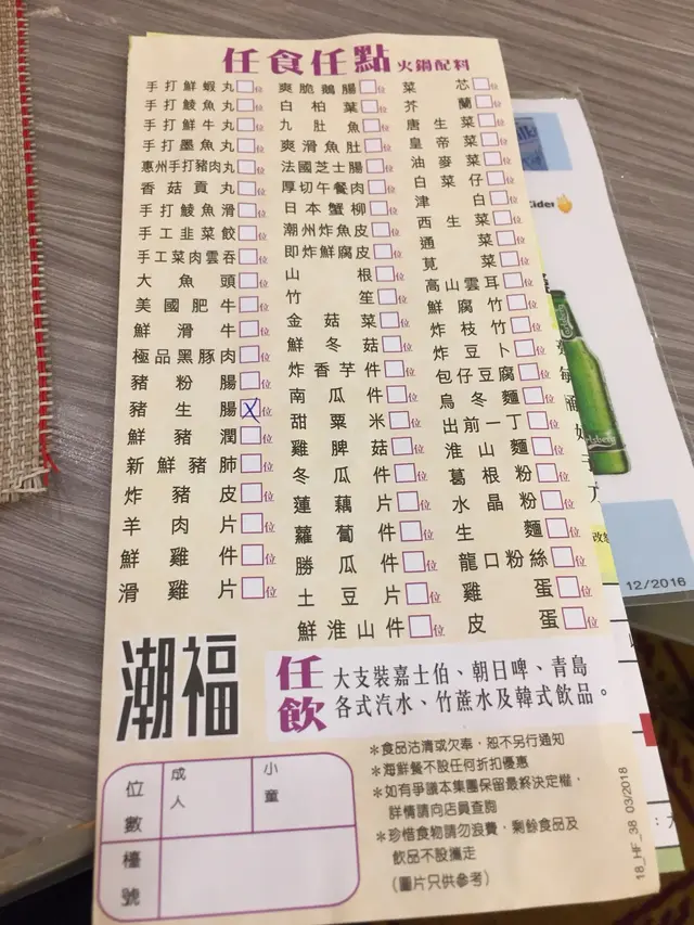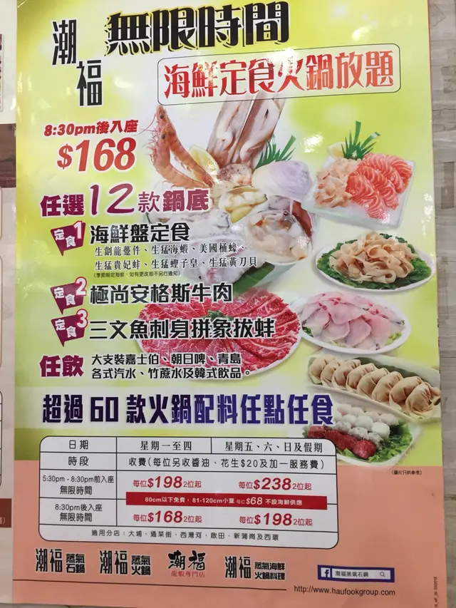 有一排冇打邊爐啦,最近天氣時凍時熱,又引返我去打邊爐先,呢間潮福好多分店,佢嘅海鮮好新鮮,價錢又平,打邊爐都吾錯。佢係一個價錢,有自選同任食menu,岩晒我地大胃之人,入去到環境舒適,先嗌左個花膠雞湯鍋,再另外點了不少海鮮,有桶蠔,海蝦, 龍躉,貴妃蚌,聖子 ,黃刀貝,好豐富丫。仲有極上安格斯牛肉,佢嘅牛真係吾錯,入口牛味濃,而且脂肪比例平均,我覺得可以不用煮太熟更加好味。任食menu我地都嗌左吾少,手打丸, 鯪魚滑,菜餃,腸仔,仲嗌左好多菜丫,粟米,金菇, 鮮淮山等等,食物好多元化,而且價錢合理,物有所值。食物環境都好滿意,而服務我都覺得好好,好細心,又會走嚟幫我地加下湯,同好有禮貌,我覺得可以再嚟,帶父母或者一大班朋友嚟食都岩丫。…查看更多