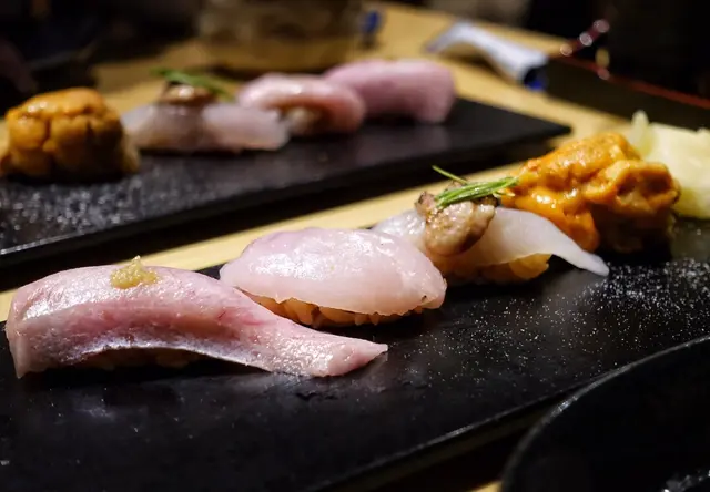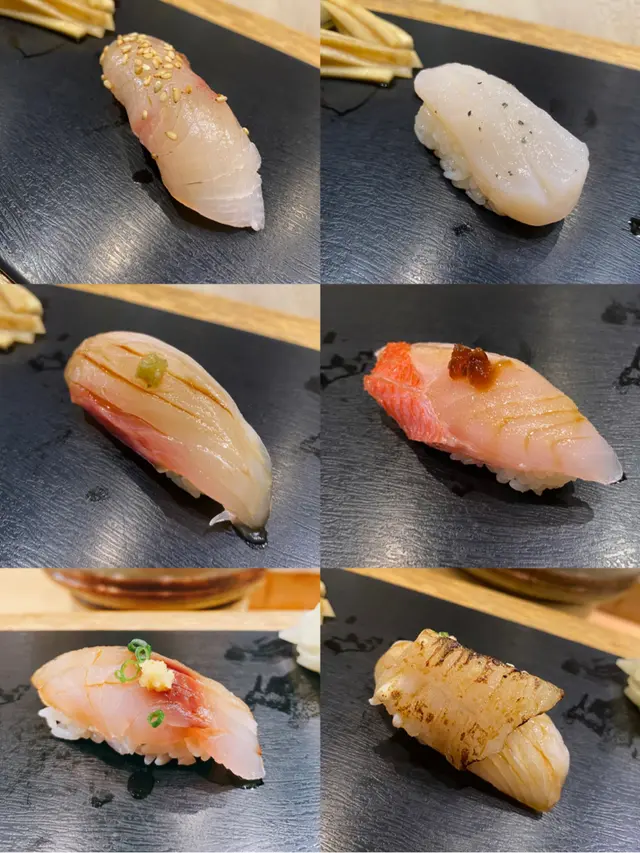 又係一月一次同朋友們嘅omakase,今次黎到跑馬地,原先以為喺呢度食一定唔會平得去邊,但somehow呢間omakase有個平平地嘅午餐set (12貫), 只需$300幾蚊,都算抵試。不過一分錢 一分貨,我覺得overall質素唔算係好高。另外呢度係無鼓油,原因係佢飯巳經加左鼓油喺入面,唔需要另外再加,不過好可惜,可能因為d飯有豉油濕濕地,所以好多時一夾𡚒飯就散。由於omakase係廚司發板,所以我覺得上每碟壽司嘅時候,師傅都至少要話比客人知係咩黎 (有d好嘅更加會介紹下d魚,用左咩烹調方法),不過呢度師傅成日都要問先會講。前菜- 滑蛋&沙律滑蛋-好嫩滑,配合冬菇食落清清地沙律-醬汁加左少少柚子嘅味道,都幾開胃蜜柑鯛 - 好鮮甜,蜜柑鯛本身味道唔錯,所以唔駛加咩醬汁都好甜好味。金目鯛 - 味道比較酸,好似加左檸檬咁。同蜜柑鯛比,蜜柑鯛味道鮮甜d,金目鯛就濃味d,重魚味。深海池魚(加紫穌葉)- 紫穌葉唔係個個鍾意,不過呢個紫穌葉味道唔重,可以癖腥 (no photo)鰤魚- 師傅用左火炙處理同埋加左柚子,但我覺得味道有d複雜,火炙味道同柚子唔太夾,所以有d影響左個鰤魚本身味道赤海蝦 - 肥美鮮甜金善鯛 - 師傅話呢種魚愈係黃愈肥 ,要有紋。食落口係幾肥,味道都幾清赤貝 - 加左檸檬一齊食,不過略嫌檸檬太多,有d搶左個味。口感好爽帶子&海膽 - 講真我覺得有少少失望,因為我好鍾意食海膽,師傅將海膽燒左,但令到本身海膽鮮味無左。加埋天婦羅帶子到搞到帶子本身味道被遮蓋左。池魚 - 清新碟魚筋 - 好香,原來筋係比碟魚本身無咁腥👍🏻銀雪魚 - 加左黑松露,好重黑松露味,反而唔係幾食到魚味。海膽 - 呢個比之前個海膽正好多!查看更多