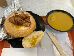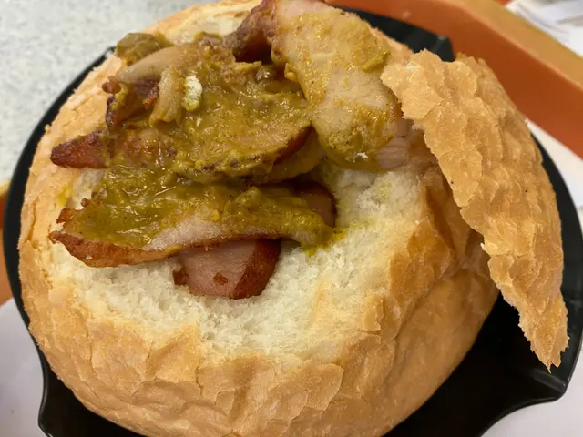 This baked farmer’s bread is super big Bigger than a head, around 4-5 fists size We tried the beef steak curry The set came with one drink and borscht, which has a few big chucks of tender beef briskets The amount of steaks is good and the bread is baked crispy Curry sauce is put in a separate bowl so it doesn’t soak the bread wet- well thought it’s a surprise that there is even table service in an indoor food market …查看更多