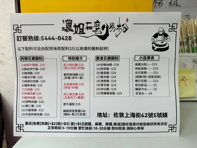 別問-亂九咁拉腸粉😂 大.寶等级42025-02-15658 瀏覽 關注 記憶中多年前店舖新開的時候,那舖不是這樣,明顯地㕑子更改了,但反正嚟到,咪照食可也囉⋯⋯看一看餐牌,被紅色字吸引,於是便選擇了”亂九咁拉腸粉”, 我諗即係Omakase 有乜落乜咁啦!門口有兩張小枱可以進食,但眼見很多人都是買外賣的。門口有筷子🥢外賣蓋,還有貼士箱,相信在繁忙時段應該很多自助。落單後㕑子就即叫即做⋯⋯點了”亂九咁拉腸”, 話明唔好問,但筆者見依個時候冇乜食客,於是仍堅持問㕑子,腸粉內會有啲乜,於是㕑子問:你唔想食乜,我話唔想食牛腩⋯⋯㕑子又問:你唔食牛嗎?我答: 不是,只是不想牛腩在腸粉內,㕑子都算細心。亂九咁拉腸粉$35~㕑子今次落了炸菜、豬肉碎、牛肉、雞蛋,份量整整一個外賣盒滿滿的,加上豉油,如果想落醬料,可以自行決定,桌子上已放上甜、辣、麻醬外,還有辣油,只是沒有芝麻。由於炸菜比較咸,再加上豉油,筆者覺得頗咸,如果將豉油的甜度加上又或者將炸菜的咸度減去會更為配合。所以味道已不用再加任何醬料了。整體來說:此店經㕑子證實已轉手,㕑子說這是鄉下開平的味道,冇所謂啦!反正每個人造法也有不同的味道,吃出誠意就可以了。…查看更多+ 2以上食評乃用戶個人意見 , 並不代表OpenRice之觀點。讚好分享別問-亂九咁拉腸粉😂 濃姐石磨腸粉 https://s.openrice.com/QrLT06OHQ00檢舉 張貼 評分4味道3環境4服務3衛生3抵食用餐日期2025-02-15用餐途徑堂食人均消費$35 (下午茶)