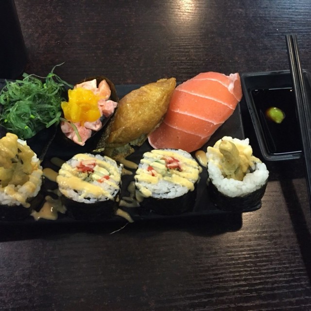 🍣 杂锦寿司拼盘 瀛素食 🍣 出开去油麻地剪头发,顺便去咗瀛素食食个午餐。瀛素食可以话系一个平民日式餐厅。虽然坐得迫迫地,但价钱平民化。午餐餐牌有五个选择。全部都系$48 仲送例汤好抵㖞。我叫咗杂锦寿司拼盘,有四件软壳蟹卷,几好味呢,「软壳蟹」脆卜卜🤪。其余四个寿司就普通嘅粟米寿司、腐皮寿司、玉子寿司。平时喺普通寿司店都食到。普普通通。另外有一件系素三文鱼寿司。咬落去有啲似蒟蒻嘅质地,其实冇乜味道。如果佢配牛油果寿司就仲好。不过以$48来讲,已经交咗功课。