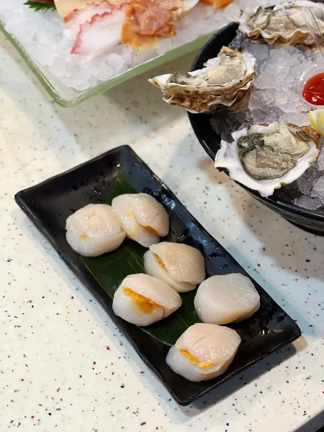 店铺放题选择多 中式日式泰式都有 好少放题有泰式食🤩放题价钱抵食 更可升级放题 有埋生蚝、海胆带子、炖汤等 .▫️刺身一开始就叫左个刺身拼盘 内有冰山蚌、八爪鱼、三文鱼、鲍片、马刀贝、角螺、赤虾、油甘鱼、希灵鱼 超丰富!赤虾大大只又鲜甜😍😍😍而海胆带子 2者放埋一齐好夹 好鲜甜 另外生蚝🦪都好大只 有海水味▪️炸物有天妇罗🍤、芝麻鸡翼、炸香蕉、芝士年糕、黄金豆腐、炸芋球等 必食芝麻鸡翼 炸得香脆 肉嫩🫶🏻▫️熟食有多款泰式小食 猪颈肉、生菜包、串烧、金边粉、炸蛋、冬阴功汤、马拉盏通菜😍 马拉盏通菜出奇地炒得有镬气!All in左2碟😜 炖汤超足料 饮落好清甜▪️甜品及雪糕除左雪条外 仲有甜品柜😍😍有Tiramisù、布丁、泡芙同榴连糯米糍🥰…查看更多