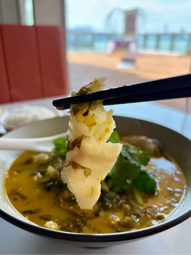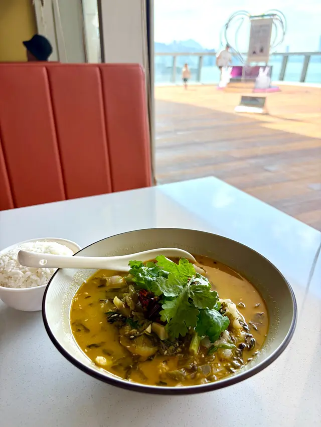 今日試咗呢間開張不久的火玲瓏,食京川滬菜嘅。餐廳仲有窗邊卡位,可以望到海景同埋商場嘅打卡位,環境舒適。午市有午市套餐價錢親民,不用加一 ,口味都幾正宗,性價比唔錯。我哋兩個人叫了兩個午市套餐,套餐包飲品或者湯,再追加了一些小食,份量相當滿足。招牌酸菜魚片飯份量相當慷慨,好多魚片,大大塊,魚肉白滑,完全冇骨,不會有魚腥味。金黃色嘅酸菜湯底好鮮味,酸辣味道適中。配菜有萵筍,大豆芽菜雲耳仲有冬粉。呢個酸菜魚仲包埋白飯,一定飽肚。手工上海小籠包(4粒)我哋呢個套餐追加了兩份小籠包,加$18就有兩隻。小籠包質素不錯,個皮好薄,而且大少少煙靭,不容易穿。入邊勁多湯汁,蘸啲醋同薑絲一齊吃,相當好味。麻婆豆腐飯麻婆豆腐味道相當惹味,豆腐粒不易爛而且有豆香,加埋啲肉碎,送飯一流。雞絲粉皮呢個套餐我哋追加咗雞絲粉皮,同樣加$18,好抵食,粉皮爽滑,撈埋青瓜絲同雞絲配合麻醬一齊食,相當清爽。最後飲埋跟餐嘅熱咖啡同埋熱檸水,再慢慢睇吓靚海景,很滿足。查看更多