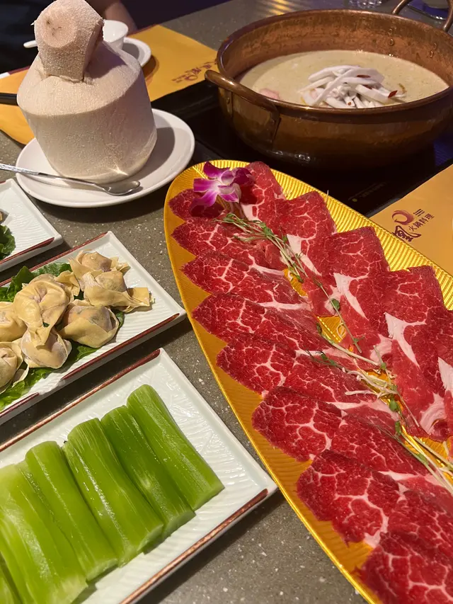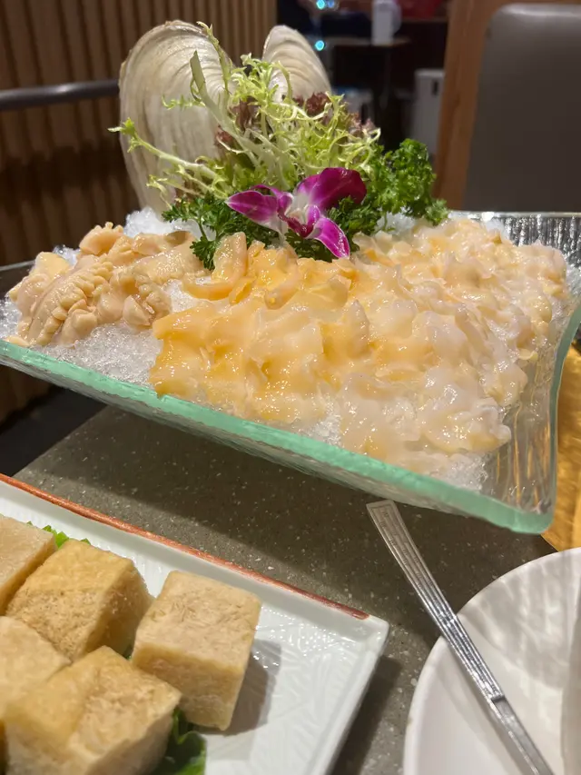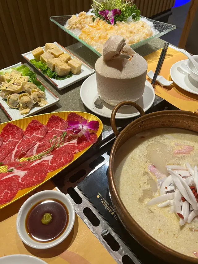 呢間打邊爐係朋友推介嘅,上到去發現店舖幾大,都幾多卡位,老闆非常熱情,為我哋介紹呢度嘅招牌。😲首先,佢哋嘅特色湯底選擇多,我地揀咗滋補椰子雞鍋,餐廳係用新鮮雞,所以食落去特別嫩滑,一啲雪味都冇,而且湯入邊仲落咗好多椰子肉,令到個湯好鮮甜又好滋潤,啱晒女士同小朋友。🍲接著,我哋見到佢有好多唔同款式嘅套餐都好吸引,就揀咗豪華必選套餐,手切安格斯牛頸脊不錯,牛肉好重味,咬落好嫩,果然係安格斯嘅級數,另外套餐仲有加拿大象拔蚌刺身,一碟例牌嘅份量都幾多,咬落去爽口又鮮甜,食得出係非常新鮮。🥩我哋仲點咗蟹籽鮮蝦滑,用新鮮嘅蝦肉打成,好彈牙,而且上耍有好多蟹籽,而最令我深刻嘅係黑松露手打墨魚丸,因為真係好香嘅黑松露味。🐙查看更多