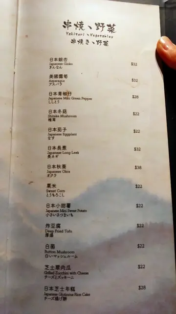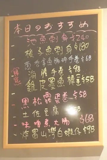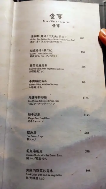Menu供应:刺身、沙律、酒肴、串烧、扬物、食事、酒类...等