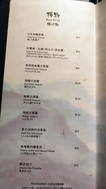 呢间位于尖沙咀既居酒屋装修冇太特别, 不过胜在啲野食够正最紧要有高质既清酒😍扬物🍟即叫即炸全部都劲脆身, 薯条我地叫左一份黑松露同一份明太子, 食完明太子果份觉得唔够味, 黑松露果份我地要求多黑松露出到黎真系劲重黑松露, 超正🤩✨炸薯条($68)✨鸡皮饺子($78)✨紫菜鱿鱼须天妇罗($68)串烧🍢全部都系即叫即烧, 所以要俾啲耐心等下, 个人觉得牛舌心真系正到爆, 厚身得黎又烧到够腍身, 调味又刚刚好, 一定要叫😍✨鸡肾($56) ✨鸡软骨($28)✨免治鸡肉棒($48)✨荔枝豚肉卷($32)✨厚切牛舌心($68)主食🍚两款都系正常发挥, 炒饭够爽身, 不过鹅肝既味道欠奉, 当系普通蛋炒饭食唔错🤣✨鸡泡鱼干($88)✨鹅肝带子炒饭($118)清酒🍶呢枝我地拣左热饮, 会将清酒分落四个樽仔度再放落热水保温, 米味浓郁, 几易入口既一款😌✨梵艳纯米大吟酿720ml($580)呢度既水准不错, 最正系个热Sake同埋牛舌心真系一试难忘🥰