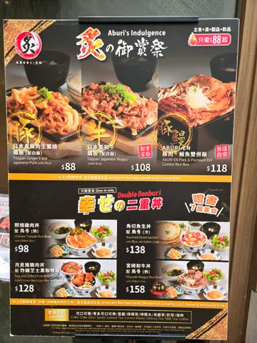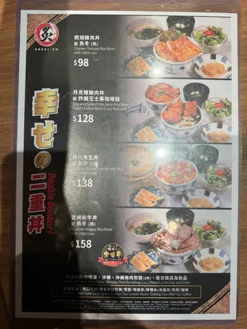 湾仔利东街有唔少餐厅,炙・宴位置唔喺大街,可能少啲人会留意到。佢哋主打系烧肉丼,不过都有鱼生饭可以拣。餐牌有个二重丼份量多多,啱晒我哋带住👦🏻又想试多啲款式嘅人。月见猪腩肉丼配炸鸡芝士黑咖喱饭烧肉丼系招牌菜,大大片猪腩肉,入口完全唔油腻,个烧汁超级好味,炸鸡有三大件,啖啖肉,够香脆,黑咖喱几特别,芝士🧀略嫌唔够多。两个饭都系有水准,不过烧肉丼实在太出色,完胜。角设鱼生丼配乌冬(冷)鱼生丼符合期望值,鱼生够新鲜,冷乌冬用冰垫住,食时放入鲣鱼汁蘸住食,Keep到乌冬嘅烟韧同弹性。两个Set都跟面豉汤、沙律、饺子、Mochi同饮品,百零蚊一个Set算合理,食物质素亦都好好,烧肉丼系必食item。…查看更多