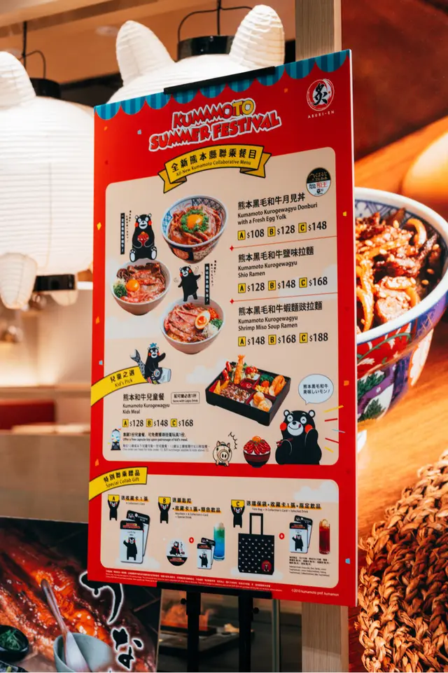炙·宴ABURI-EN近日與日本熊本縣合作推出期間限定主題店。由即日起,店內隨處可見熊本熊的蹤影,包括1.8米高佈景板和多款裝飾,吸引不少粉絲前來打卡。除了環境佈置,餐廳亦推出多款以熊本縣黑毛和牛為主的限定菜式,並附送熊本熊周邊精品。.日本熊本縣聯乘活動內容.🐻熊本黑毛和牛月見丼🐻熊本黑毛和牛蝦麵豉拉麵🐻熊本黑毛和牛鹽味拉麵🐻熊本和牛兒童餐🍹特色飲品.惠顧精選套餐,更會送出《熊本熊》限定版周邊精品🐻熊本熊環保袋1個 🐻熊本熊鎖匙扣1個🐻熊本熊語錄收藏卡一套四款.熊本黑毛和牛月見丼選用優質和牛,肉質細嫩,油花均勻,輕炙後肉香濃郁。半熟蛋黃與和牛油脂融合,配秘製燒肉醬汁,味道豐富。日本米粒粒分明,米香與和牛相襯。.熊本黑毛和牛蝦麵豉拉麵以蝦殼熬湯,加入麵豉增添香氣。和牛片軟嫩,與湯底相得益彰。.熊本黑毛和牛鹽味拉麵湯底清澈,突出和牛原味。和牛片入口即化,與清爽湯底平衡。拉麵質感佳,配海苔及蔥段,簡單卻有層次。個人首推。.熊本和牛兒童餐含迷你和牛丼飯、天婦羅炸海老、沙律及薯條,份量適中,附乳酸飲品,賣相精緻,適合小朋友。…查看更多