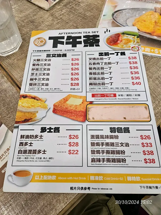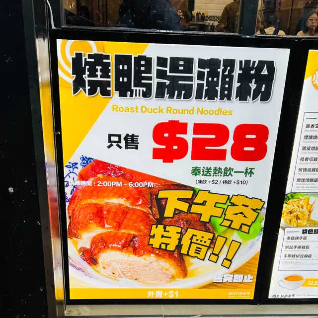 $28燒鴨瀨下午茶無得輸上個星期行過睇到poster話$28燒鴨瀨,因為已經食左,所以plan左今日食。味道(3分)燒鴨瀨 ($28)4分— 燒鴨分量都吾少,睇相都估到吾會鞋,系皮吾脆,味道都幾好— 瀨粉系超滑超爽,正— 雖然$28,都做足比兩條菜。雙拼三文治($28)3分— 麵包系老餅茶餐廳,比較薄,所以有雞蛋就整件麵包都濕曬扁曬。— 咸牛肉比較少環境(3分)— 無卡位,中間座位又比較密,可能咁影響左無乜客,亦絕大部分系一個人— 裝修比較舊服務(3分)正常衛生(3分)— 正常抵食 (5分)— 哩兩個餐真系性價比非常高。…查看更多
