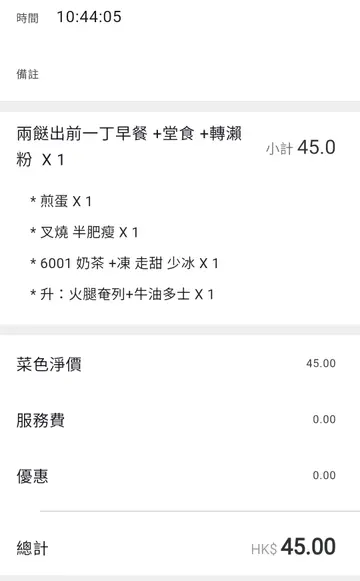 加左8蚊嘅奄列同多士:多士就流流地,只系半块烘左嘅方包,不过佢个奄列唔野少,大过我只手掌,仲要爆多火腿丝,好似唔使钱咁。简单啲讲,净系个奄列都值回8蚊嘅票价。至于佢杯奶茶,我拣咗少冰走甜,其他奶同茶嘅比例冇专登要求(佢有得拣多奶,少奶,好似仲有得拣啲茶底浓啲,淡啲,太多选择唔记得咗