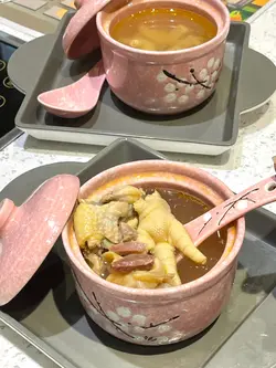 奉送時令燉湯需早一天訂座及確認選餐,特色之一是餐廳會用當季最新鮮食材熬製,保證足料,夠火喉,色澤金黃透亮,湯頭散發濃郁雞香,入口鮮甜,味道醇厚養生。