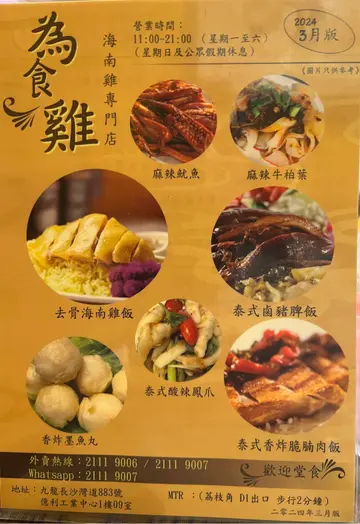 本来想去深水埗捌哥,最后都系选左哩间未食过的海南鸡。哩间铺头系地铁站附近一间比较有历史的工厂大厦1楼,吾系附近做野或者有人提过真系吾会来,1点几来到都重差不多满,吾错喔。环境就好系厂大厦饭堂,好简单,长台座位比较逼,好在伙计都比我地两个人坐window seat 卡位比较舒服。海南鸡餐牌价钱同我favourite 柏档同最出位的勇记差不多,但环境装修,或者品牌当然就差D,所以计起来就系比较贵喽。朋友话来哩度一定要食肶,卖相真系几得,睇到都知道滑吾话啦!鸡应该好大只,鸡皮有油糕,但爽得来吾觉得肥,鸡肉都几有鸡味。有两种酱料,鼓油正常,辣酱带酸味,吾系死辣,OK。鸡油饭就有非常失色,第一无香味,第二太多水同米散,第三系两碟饭都有D 硬块,又睇吾到系焦,可能系饭煲边挂。个汤虽然吾系乜椰子鸡或者鸡杂汤,只系红萝卜,鸡脚,薏米,最重要系加左好香的陈皮,吾系个汤,个餐会比个饭拖累到吾合格。